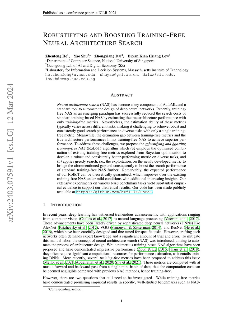 Neural architecture search (NAS) has become a key component of AutoML and a standard tool to automate the design of deep neural networks. Recently, training-free NAS as an emerging paradigm has successfully reduced the search costs of standard training-based NAS by estimating the true architecture performance with only training-free metrics. Nevertheless, the estimation ability of these metrics typically varies across different tasks, making it challenging to achieve robust and consistently good search performance on diverse tasks with only a single training-free metric. Meanwhile, the estimation gap between training-free metrics and the true architecture performances limits training-free NAS to achieve superior performance. To address these challenges, we propose the robustifying and boosting training-free NAS (RoBoT) algorithm which (a) employs the optimized combination of existing training-free metrics explored from Bayesian optimization to develop a robust and consistently better-performing metric on diverse tasks, and (b) applies greedy search, i.e., the exploitation, on the newly developed metric to bridge the aforementioned gap and consequently to boost the search performance of standard training-free NAS further. Remarkably, the expected performance of our RoBoT can be theoretically guaranteed, which improves over the existing training-free NAS under mild conditions with additional interesting insights. Our extensive experiments on various NAS benchmark tasks yield substantial empirical evidence to support our theoretical results.