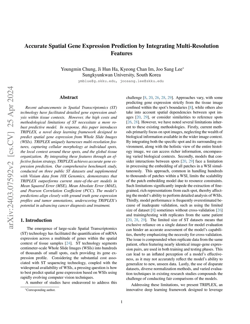 Recent advancements in Spatial Transcriptomics (ST) technology have facilitated detailed gene expression analysis within tissue contexts. However, the high costs and methodological limitations of ST necessitate a more robust predictive model. In response, this paper introduces TRIPLEX, a novel deep learning framework designed to predict spatial gene expression from Whole Slide Images (WSIs). TRIPLEX uniquely harnesses multi-resolution features, capturing cellular morphology at individual spots, the local context around these spots, and the global tissue organization. By integrating these features through an effective fusion strategy, TRIPLEX achieves accurate gene expression prediction. Our comprehensive benchmark study, conducted on three public ST datasets and supplemented with Visium data from 10X Genomics, demonstrates that TRIPLEX outperforms current state-of-the-art models in Mean Squared Error (MSE), Mean Absolute Error (MAE), and Pearson Correlation Coefficient (PCC). The model's predictions align closely with ground truth gene expression profiles and tumor annotations, underscoring TRIPLEX's potential in advancing cancer diagnosis and treatment.