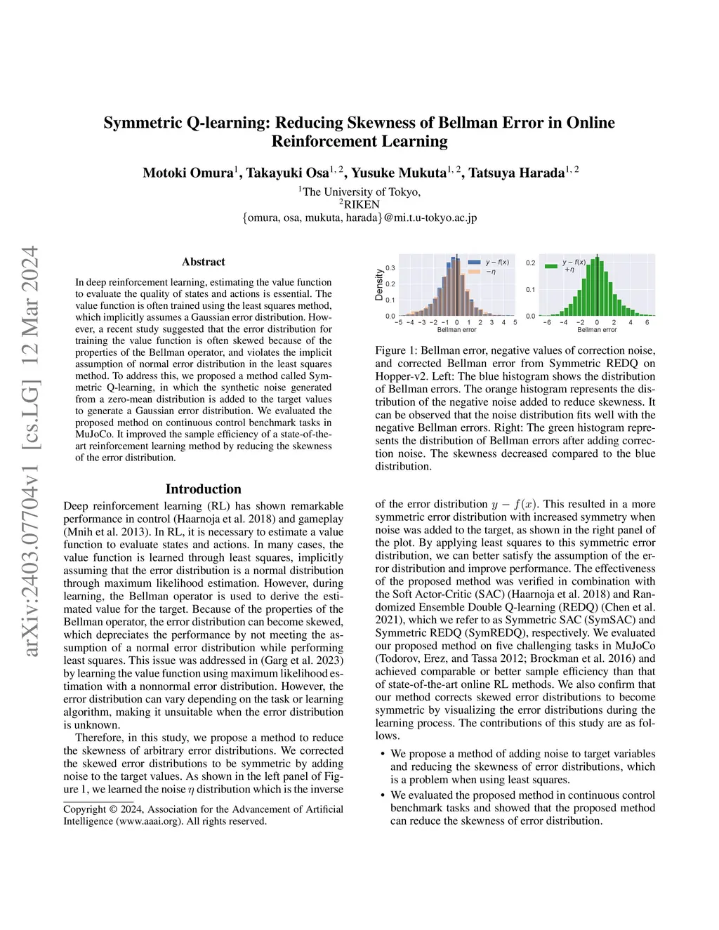 In deep reinforcement learning, estimating the value function to evaluate the quality of states and actions is essential. The value function is often trained using the least squares method, which implicitly assumes a Gaussian error distribution. However, a recent study suggested that the error distribution for training the value function is often skewed because of the properties of the Bellman operator, and violates the implicit assumption of normal error distribution in the least squares method. To address this, we proposed a method called Symmetric Q-learning, in which the synthetic noise generated from a zero-mean distribution is added to the target values to generate a Gaussian error distribution. We evaluated the proposed method on continuous control benchmark tasks in MuJoCo. It improved the sample efficiency of a state-of-the-art reinforcement learning method by reducing the skewness of the error distribution.