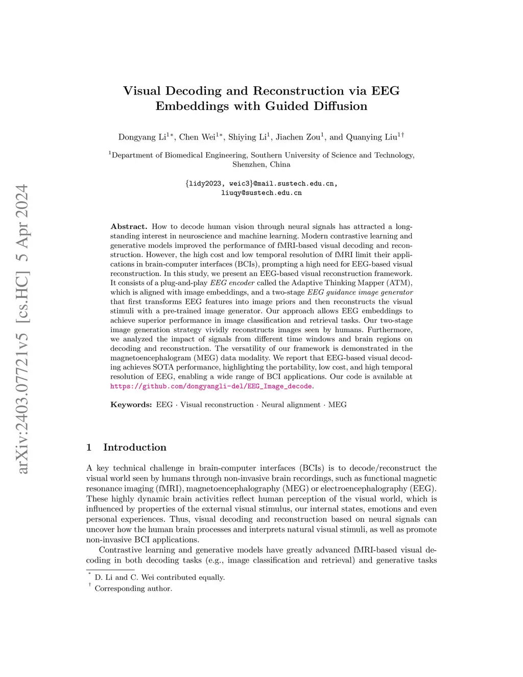 How to decode human vision through neural signals has attracted a long-standing interest in neuroscience and machine learning. Modern contrastive learning and generative models improved the performance of fMRI-based visual decoding and reconstruction. However, the high cost and low temporal resolution of fMRI limit their applications in brain-computer interfaces (BCIs), prompting a high need for EEG-based visual reconstruction. In this study, we present an EEG-based visual reconstruction framework. It consists of a plug-and-play EEG encoder called the Adaptive Thinking Mapper (ATM), which is aligned with image embeddings, and a two-stage EEG guidance image generator that first transforms EEG features into image priors and then reconstructs the visual stimuli with a pre-trained image generator. Our approach allows EEG embeddings to achieve superior performance in image classification and retrieval tasks. Our two-stage image generation strategy vividly reconstructs images seen by humans. Furthermore, we analyzed the impact of signals from different time windows and brain regions on decoding and reconstruction. The versatility of our framework is demonstrated in the magnetoencephalogram (MEG) data modality. We report that EEG-based visual decoding achieves SOTA performance, highlighting the portability, low cost, and high temporal resolution of EEG, enabling a wide range of BCI applications. The code of ATM is available at https://github.com/dongyangli-del/EEG_Image_decode.
