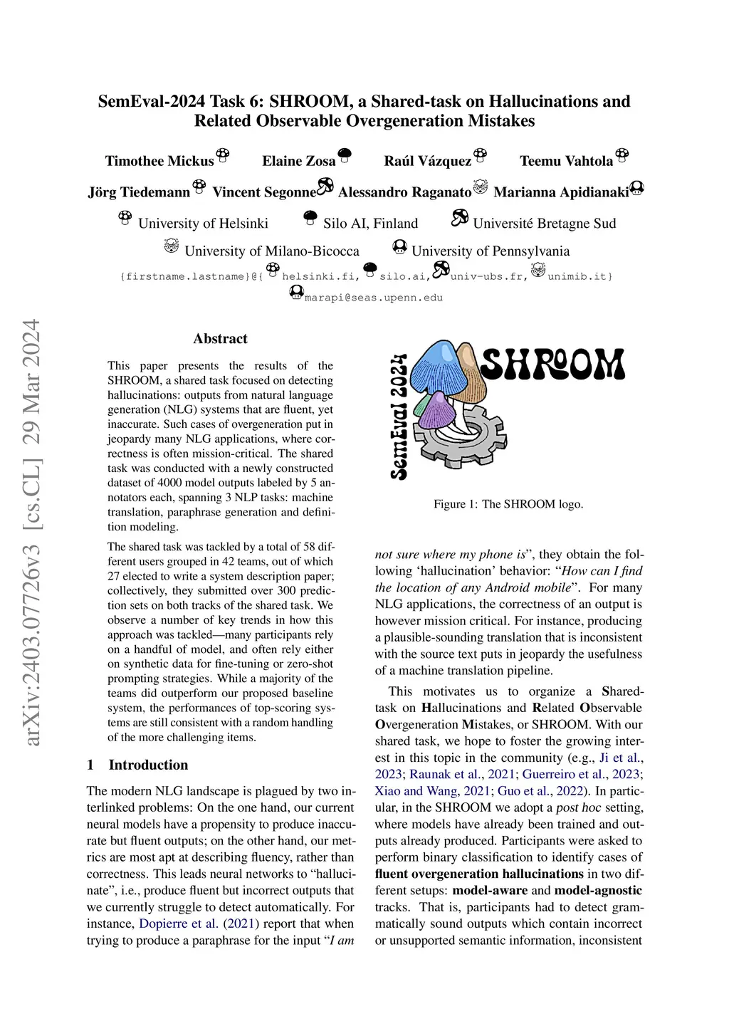 This paper presents the results of the SHROOM, a shared task focused on detecting hallucinations: outputs from natural language generation (NLG) systems that are fluent, yet inaccurate. Such cases of overgeneration put in jeopardy many NLG applications, where correctness is often mission-critical. The shared task was conducted with a newly constructed dataset of 4000 model outputs labeled by 5 annotators each, spanning 3 NLP tasks: machine translation, paraphrase generation and definition modeling. The shared task was tackled by a total of 58 different users grouped in 42 teams, out of which 27 elected to write a system description paper; collectively, they submitted over 300 prediction sets on both tracks of the shared task. We observe a number of key trends in how this approach was tackled -- many participants rely on a handful of model, and often rely either on synthetic data for fine-tuning or zero-shot prompting strategies. While a majority of the teams did outperform our proposed baseline system, the performances of top-scoring systems are still consistent with a random handling of the more challenging items.