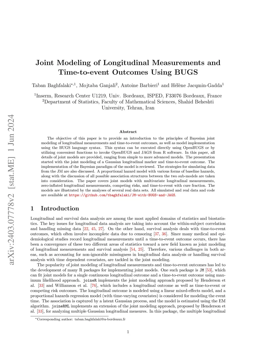 The objective of this paper is to provide an introduction to the principles of Bayesian joint modeling of longitudinal measurements and time-to-event outcomes, as well as model implementation using the BUGS language syntax. This syntax can be executed directly using OpenBUGS or by utilizing convenient functions to invoke OpenBUGS and JAGS from R software. In this paper, all details of joint models are provided, ranging from simple to more advanced models. The presentation started with the joint modeling of a Gaussian longitudinal marker and time-to-event outcome. The implementation of the Bayesian paradigm of the model is reviewed. The strategies for simulating data from the JM are also discussed. A proportional hazard model with various forms of baseline hazards, along with the discussion of all possible association structures between the two sub-models are taken into consideration. The paper covers joint models with multivariate longitudinal measurements, zero-inflated longitudinal measurements, competing risks, and time-to-event with cure fraction. The models are illustrated by the analyses of several real data sets. All simulated and real data and code are available at \url{https://github.com/tbaghfalaki/JM-with-BUGS-and-JAGS}.