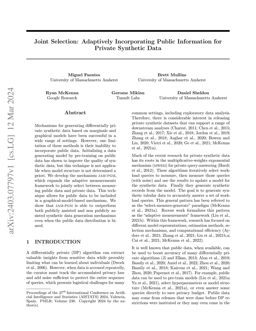 Mechanisms for generating differentially private synthetic data based on marginals and graphical models have been successful in a wide range of settings. However, one limitation of these methods is their inability to incorporate public data. Initializing a data generating model by pre-training on public data has shown to improve the quality of synthetic data, but this technique is not applicable when model structure is not determined a priori. We develop the mechanism jam-pgm, which expands the adaptive measurements framework to jointly select between measuring public data and private data. This technique allows for public data to be included in a graphical-model-based mechanism. We show that jam-pgm is able to outperform both publicly assisted and non publicly assisted synthetic data generation mechanisms even when the public data distribution is biased.