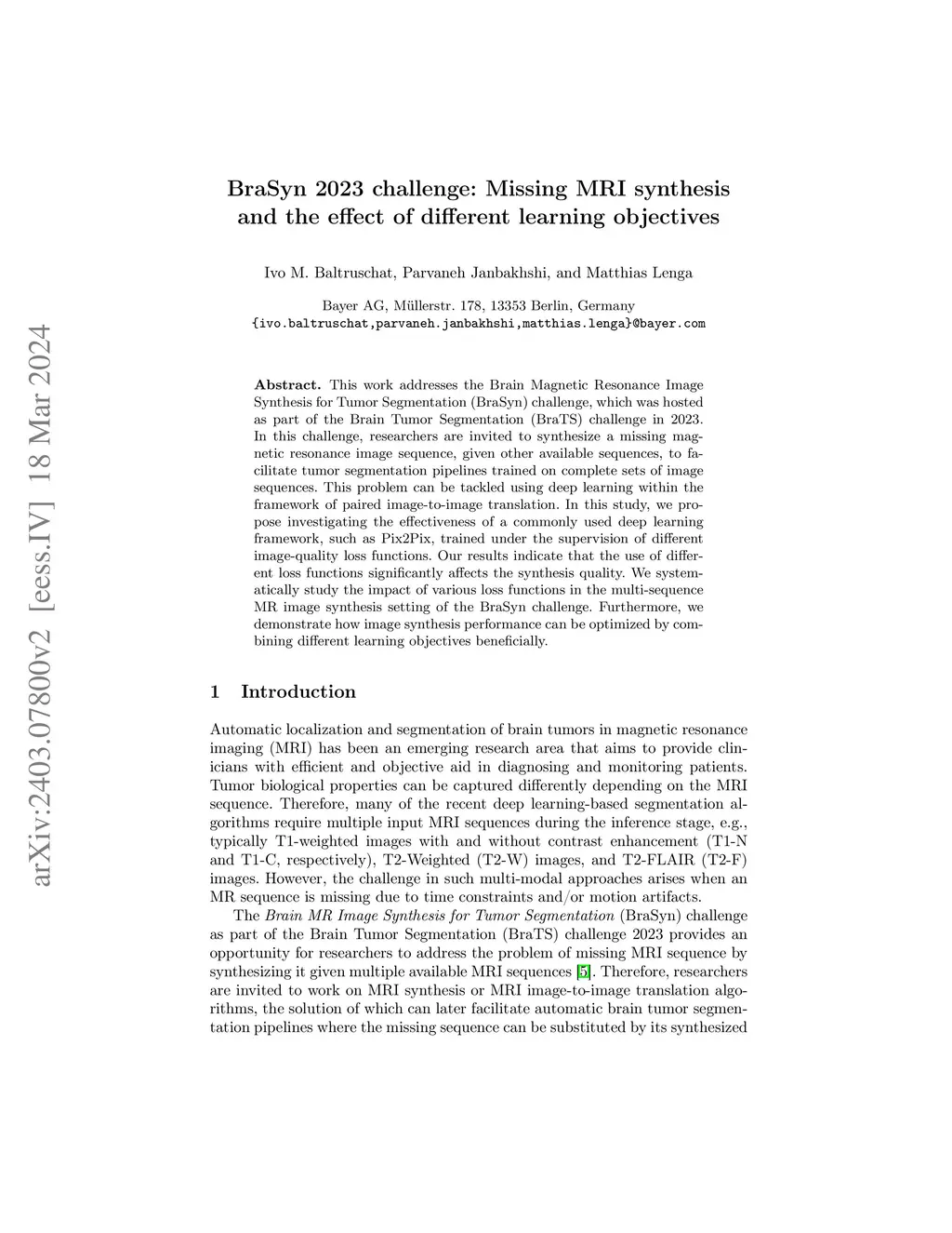 This work is addressing the Brain Magnetic Resonance Image Synthesis for Tumor Segmentation (BraSyn) challenge which was hosted as part of the Brain Tumor Segmentation challenge (BraTS) 2023. In this challenge researchers are invited to work on synthesizing a missing magnetic resonance image sequence given other available sequences to facilitate tumor segmentation pipelines trained on complete sets of image sequences. This problem can be addressed using deep learning in the framework of paired images-to-image translation. In this work, we proposed to investigate the effectiveness of a commonly-used deep learning framework such as Pix2Pix trained under supervision of different image-quality loss functions. Our results indicate that using different loss functions significantly affects the synthesis quality. We systematically study the impact of different loss functions in the multi-sequence MR image synthesis setting of the BraSyn challenge. Furthermore, we show how image synthesis performance can be optimized by beneficially combining different learning objectives.