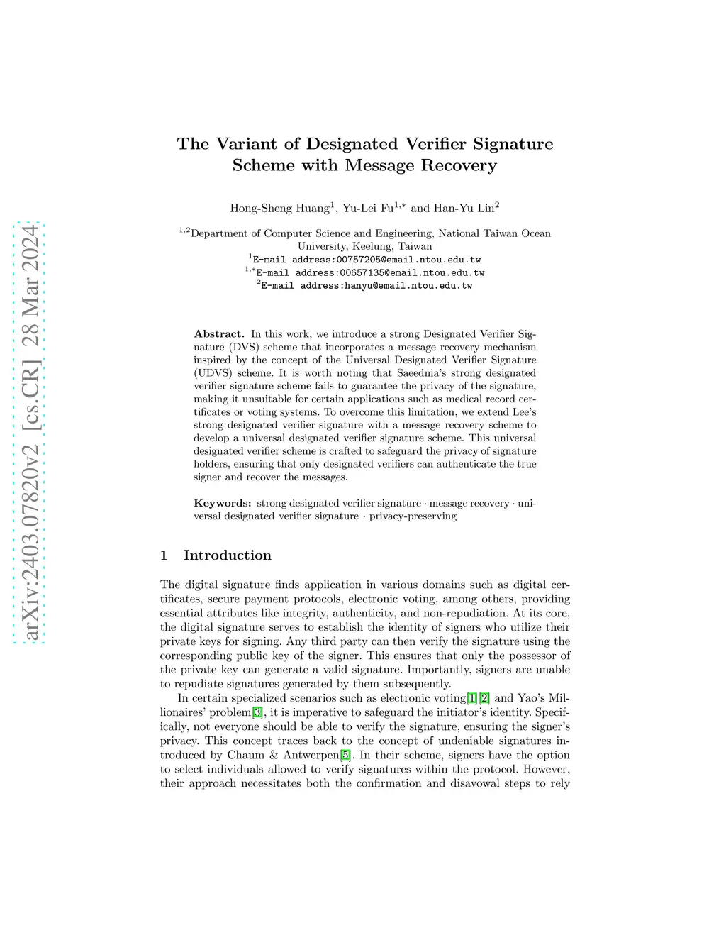 In this work, we introduce a strong Designated Verifier Signature (DVS) scheme that incorporates a message recovery mechanism inspired by the concept of the Universal Designated Verifier Signature (UDVS) scheme. It is worth noting that Saeednia's strong designated verifier signature scheme fails to guarantee the privacy of the signature, making it unsuitable for certain applications such as medical record certificates or voting systems. To overcome this limitation, we extend Lee's strong designated verifier signature with a message recovery scheme to develop a universal designated verifier signature scheme. This universal designated verifier scheme is crafted to safeguard the privacy of signature holders, ensuring that only designated verifiers can authenticate the true signer and recover the messages.