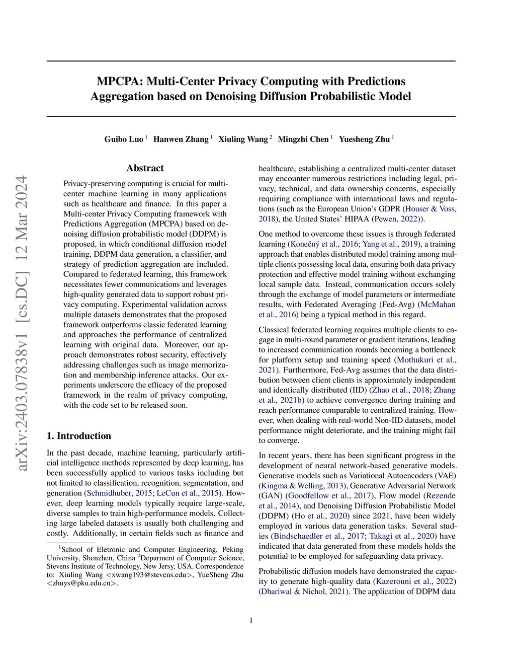 Privacy-preserving computing is crucial for multi-center machine learning in many applications such as healthcare and finance. In this paper a Multi-center Privacy Computing framework with Predictions Aggregation (MPCPA) based on denoising diffusion probabilistic model (DDPM) is proposed, in which conditional diffusion model training, DDPM data generation, a classifier, and strategy of prediction aggregation are included. Compared to federated learning, this framework necessitates fewer communications and leverages high-quality generated data to support robust privacy computing. Experimental validation across multiple datasets demonstrates that the proposed framework outperforms classic federated learning and approaches the performance of centralized learning with original data. Moreover, our approach demonstrates robust security, effectively addressing challenges such as image memorization and membership inference attacks. Our experiments underscore the efficacy of the proposed framework in the realm of privacy computing, with the code set to be released soon.