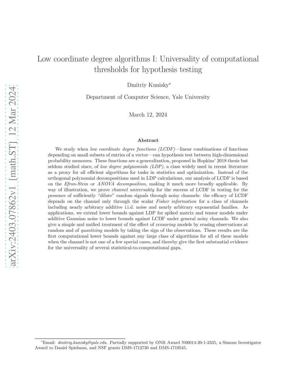 We study when low coordinate degree functions (LCDF) -- linear combinations of functions depending on small subsets of entries of a vector -- can hypothesis test between high-dimensional probability measures. These functions are a generalization, proposed in Hopkins' 2018 thesis but seldom studied since, of low degree polynomials (LDP), a class widely used in recent literature as a proxy for all efficient algorithms for tasks in statistics and optimization. Instead of the orthogonal polynomial decompositions used in LDP calculations, our analysis of LCDF is based on the Efron-Stein or ANOVA decomposition, making it much more broadly applicable. By way of illustration, we prove channel universality for the success of LCDF in testing for the presence of sufficiently "dilute" random signals through noisy channels: the efficacy of LCDF depends on the channel only through the scalar Fisher information for a class of channels including nearly arbitrary additive i.i.d. noise and nearly arbitrary exponential families. As applications, we extend lower bounds against LDP for spiked matrix and tensor models under additive Gaussian noise to lower bounds against LCDF under general noisy channels. We also give a simple and unified treatment of the effect of censoring models by erasing observations at random and of quantizing models by taking the sign of the observations. These results are the first computational lower bounds against any large class of algorithms for all of these models when the channel is not one of a few special cases, and thereby give the first substantial evidence for the universality of several statistical-to-computational gaps.