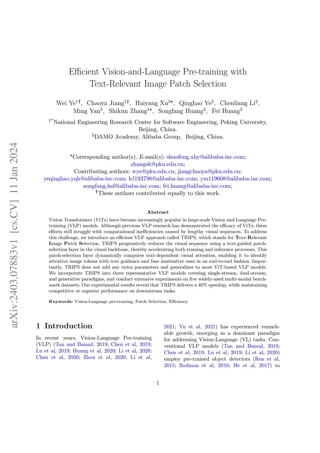 Vision Transformers (ViTs) have become increasingly popular in large-scale Vision and Language Pre-training (VLP) models. Although previous VLP research has demonstrated the efficacy of ViTs, these efforts still struggle with computational inefficiencies caused by lengthy visual sequences. To address this challenge, we introduce an efficient VLP approach called TRIPS, which stands for Text-Relevant Image Patch Selection. TRIPS progressively reduces the visual sequence using a text-guided patch-selection layer in the visual backbone, thereby accelerating both training and inference processes. This patch-selection layer dynamically computes text-dependent visual attention, enabling it to identify attentive image tokens with text guidance and fuse inattentive ones in an end-to-end fashion. Importantly, TRIPS does not add any extra parameters and generalizes to most ViT-based VLP models. We incorporate TRIPS into three representative VLP models covering single-stream, dual-stream, and generative paradigms, and conduct extensive experiments on five widely-used multi-modal benchmark datasets. Our experimental results reveal that TRIPS delivers a 40% speedup, while maintaining competitive or superior performance on downstream tasks.