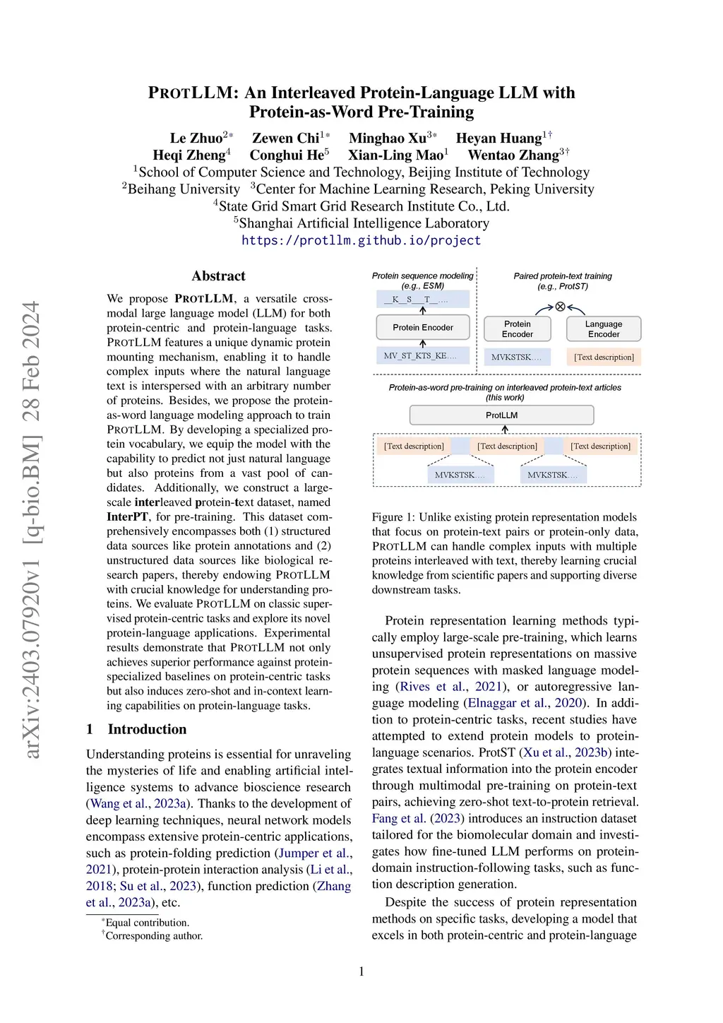 We propose ProtLLM, a versatile cross-modal large language model (LLM) for both protein-centric and protein-language tasks. ProtLLM features a unique dynamic protein mounting mechanism, enabling it to handle complex inputs where the natural language text is interspersed with an arbitrary number of proteins. Besides, we propose the protein-as-word language modeling approach to train ProtLLM. By developing a specialized protein vocabulary, we equip the model with the capability to predict not just natural language but also proteins from a vast pool of candidates. Additionally, we construct a large-scale interleaved protein-text dataset, named InterPT, for pre-training. This dataset comprehensively encompasses both (1) structured data sources like protein annotations and (2) unstructured data sources like biological research papers, thereby endowing ProtLLM with crucial knowledge for understanding proteins. We evaluate ProtLLM on classic supervised protein-centric tasks and explore its novel protein-language applications. Experimental results demonstrate that ProtLLM not only achieves superior performance against protein-specialized baselines on protein-centric tasks but also induces zero-shot and in-context learning capabilities on protein-language tasks.
