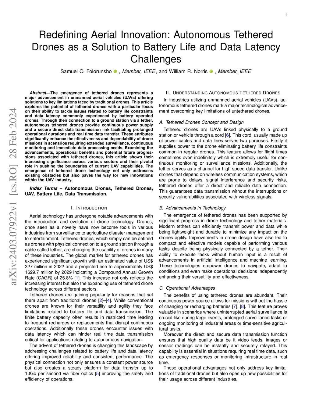 The emergence of tethered drones represents a major advancement in unmanned aerial vehicles (UAVs) offering solutions to key limitations faced by traditional drones. This article explores the potential of tethered drones with a particular focus on their ability to tackle issues related to battery life constraints and data latency commonly experienced by battery operated drones. Through their connection to a ground station via a tether, autonomous tethered drones provide continuous power supply and a secure direct data transmission link facilitating prolonged operational durations and real time data transfer. These attributes significantly enhance the effectiveness and dependability of drone missions in scenarios requiring extended surveillance, continuous monitoring and immediate data processing needs. Examining the advancements, operational benefits and potential future progressions associated with tethered drones, this article shows their increasing significance across various sectors and their pivotal role in pushing the boundaries of current UAV capabilities. The emergence of tethered drone technology not only addresses existing obstacles but also paves the way for new innovations within the UAV industry.