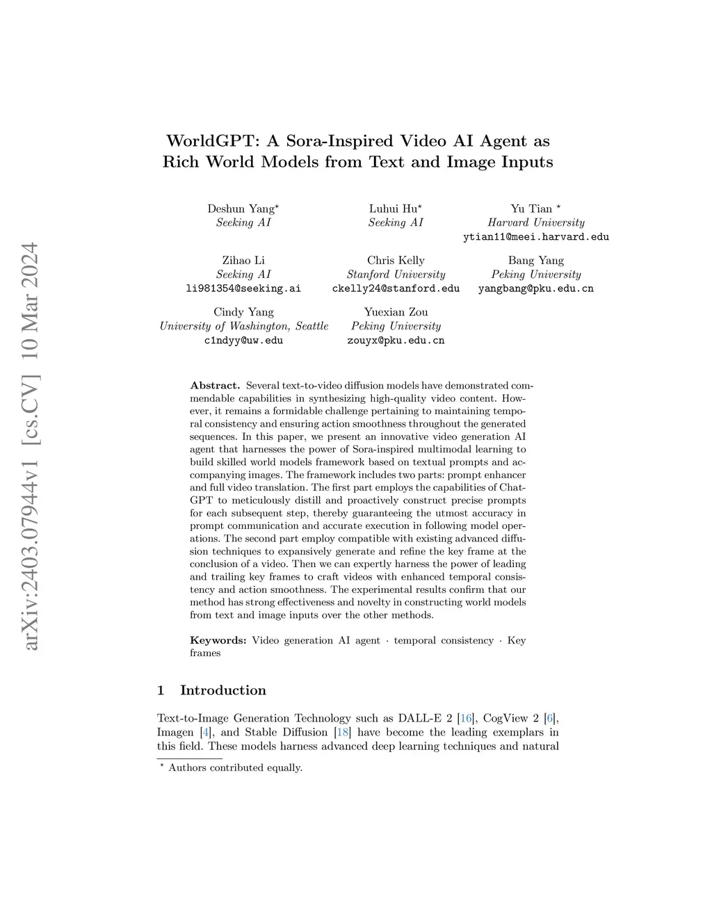 Several text-to-video diffusion models have demonstrated commendable capabilities in synthesizing high-quality video content. However, it remains a formidable challenge pertaining to maintaining temporal consistency and ensuring action smoothness throughout the generated sequences. In this paper, we present an innovative video generation AI agent that harnesses the power of Sora-inspired multimodal learning to build skilled world models framework based on textual prompts and accompanying images. The framework includes two parts: prompt enhancer and full video translation. The first part employs the capabilities of ChatGPT to meticulously distill and proactively construct precise prompts for each subsequent step, thereby guaranteeing the utmost accuracy in prompt communication and accurate execution in following model operations. The second part employ compatible with existing advanced diffusion techniques to expansively generate and refine the key frame at the conclusion of a video. Then we can expertly harness the power of leading and trailing key frames to craft videos with enhanced temporal consistency and action smoothness. The experimental results confirm that our method has strong effectiveness and novelty in constructing world models from text and image inputs over the other methods.