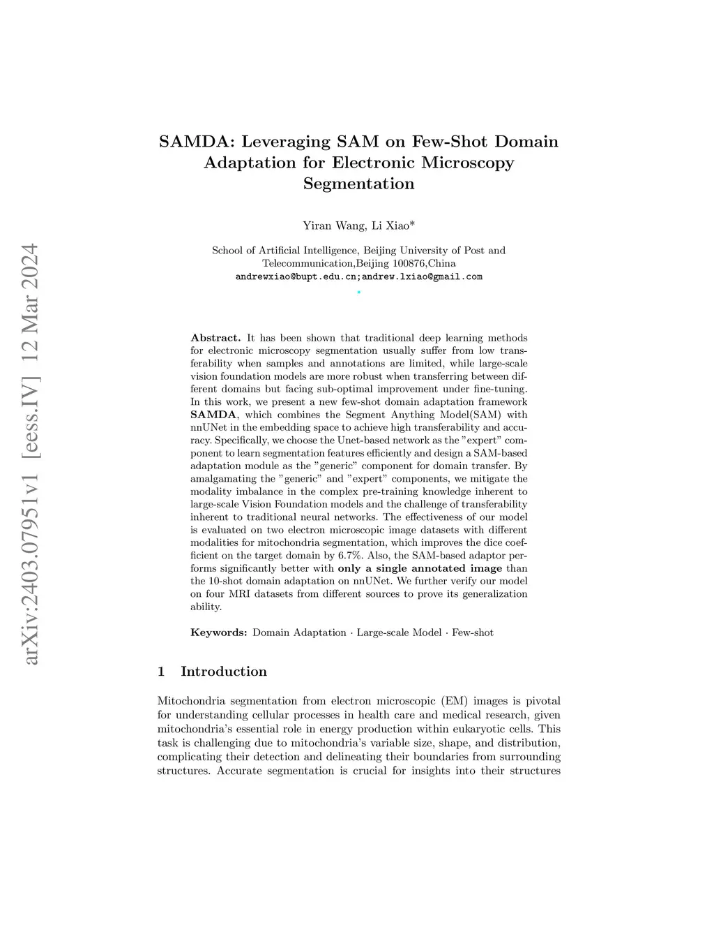 It has been shown that traditional deep learning methods for electronic microscopy segmentation usually suffer from low transferability when samples and annotations are limited, while large-scale vision foundation models are more robust when transferring between different domains but facing sub-optimal improvement under fine-tuning. In this work, we present a new few-shot domain adaptation framework SAMDA, which combines the Segment Anything Model(SAM) with nnUNet in the embedding space to achieve high transferability and accuracy. Specifically, we choose the Unet-based network as the "expert" component to learn segmentation features efficiently and design a SAM-based adaptation module as the "generic" component for domain transfer. By amalgamating the "generic" and "expert" components, we mitigate the modality imbalance in the complex pre-training knowledge inherent to large-scale Vision Foundation models and the challenge of transferability inherent to traditional neural networks. The effectiveness of our model is evaluated on two electron microscopic image datasets with different modalities for mitochondria segmentation, which improves the dice coefficient on the target domain by 6.7%. Also, the SAM-based adaptor performs significantly better with only a single annotated image than the 10-shot domain adaptation on nnUNet. We further verify our model on four MRI datasets from different sources to prove its generalization ability.