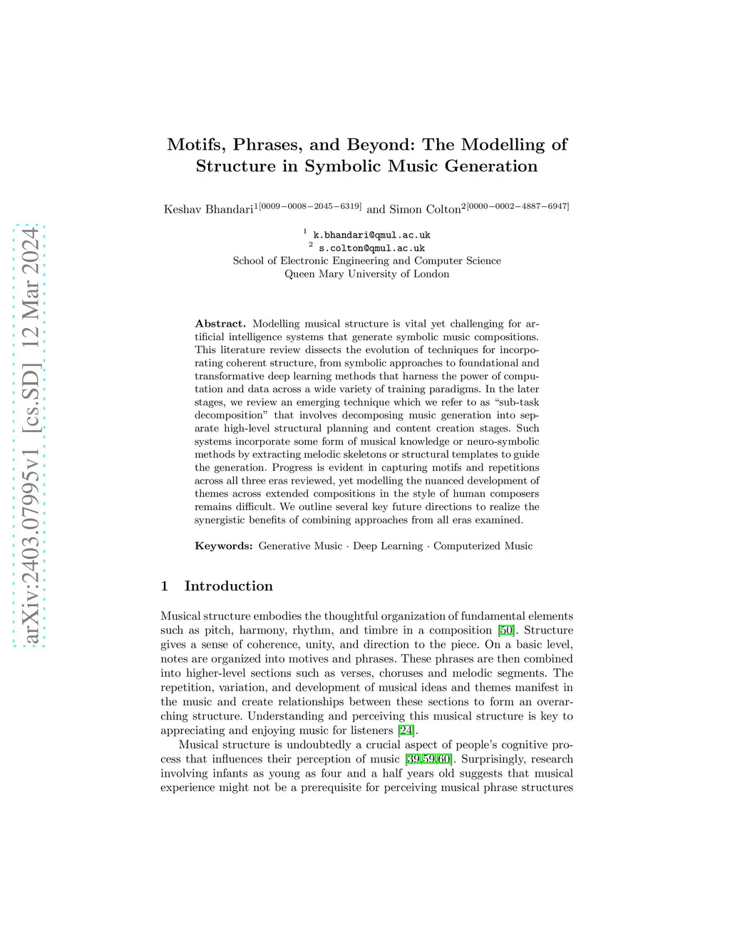 Modelling musical structure is vital yet challenging for artificial intelligence systems that generate symbolic music compositions. This literature review dissects the evolution of techniques for incorporating coherent structure, from symbolic approaches to foundational and transformative deep learning methods that harness the power of computation and data across a wide variety of training paradigms. In the later stages, we review an emerging technique which we refer to as "sub-task decomposition" that involves decomposing music generation into separate high-level structural planning and content creation stages. Such systems incorporate some form of musical knowledge or neuro-symbolic methods by extracting melodic skeletons or structural templates to guide the generation. Progress is evident in capturing motifs and repetitions across all three eras reviewed, yet modelling the nuanced development of themes across extended compositions in the style of human composers remains difficult. We outline several key future directions to realize the synergistic benefits of combining approaches from all eras examined.
