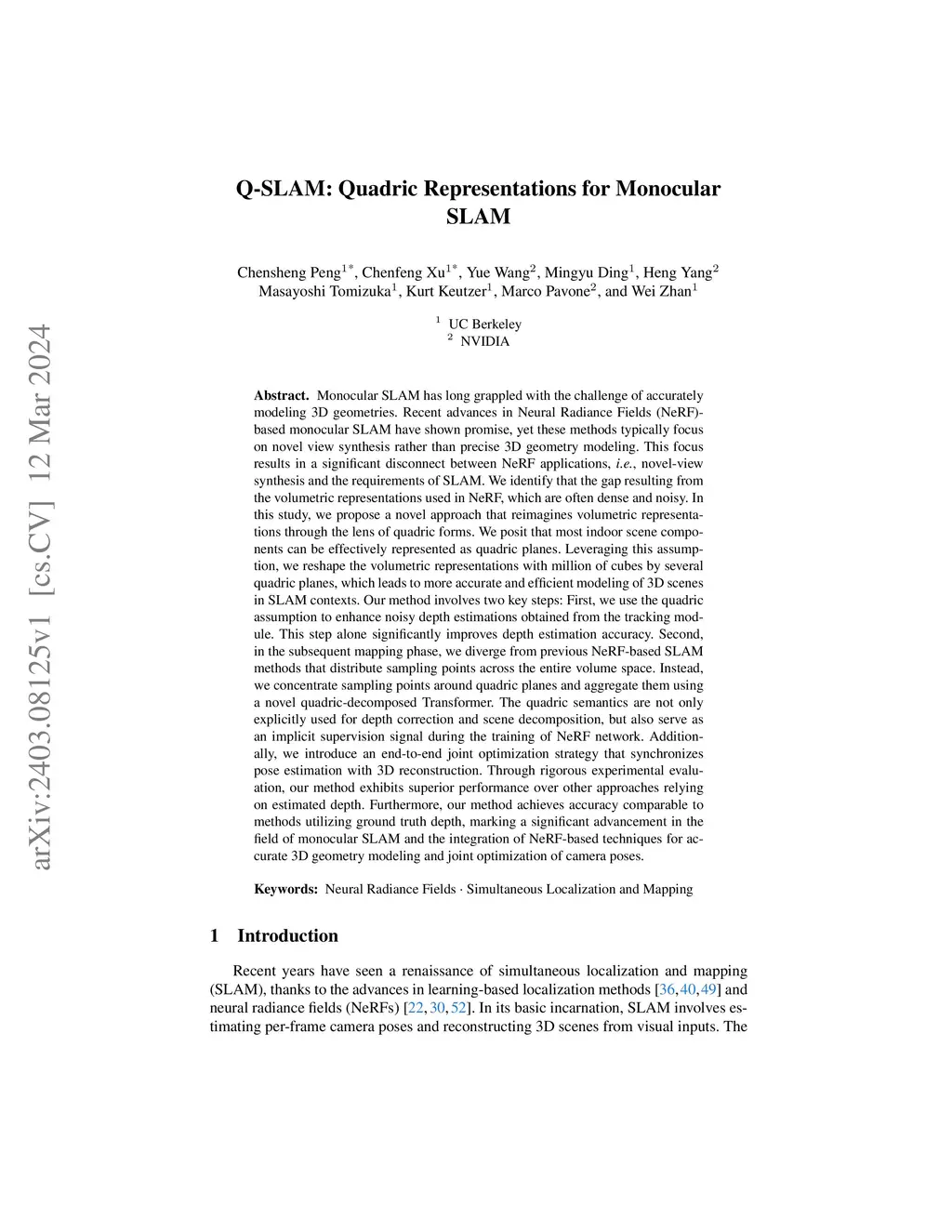 Monocular SLAM has long grappled with the challenge of accurately modeling 3D geometries. Recent advances in Neural Radiance Fields (NeRF)-based monocular SLAM have shown promise, yet these methods typically focus on novel view synthesis rather than precise 3D geometry modeling. This focus results in a significant disconnect between NeRF applications, i.e., novel-view synthesis and the requirements of SLAM. We identify that the gap results from the volumetric representations used in NeRF, which are often dense and noisy. In this study, we propose a novel approach that reimagines volumetric representations through the lens of quadric forms. We posit that most scene components can be effectively represented as quadric planes. Leveraging this assumption, we reshape the volumetric representations with million of cubes by several quadric planes, which leads to more accurate and efficient modeling of 3D scenes in SLAM contexts. Our method involves two key steps: First, we use the quadric assumption to enhance coarse depth estimations obtained from tracking modules, e.g., Droid-SLAM. This step alone significantly improves depth estimation accuracy. Second, in the subsequent mapping phase, we diverge from previous NeRF-based SLAM methods that distribute sampling points across the entire volume space. Instead, we concentrate sampling points around quadric planes and aggregate them using a novel quadric-decomposed Transformer. Additionally, we introduce an end-to-end joint optimization strategy that synchronizes pose estimation with 3D reconstruction.