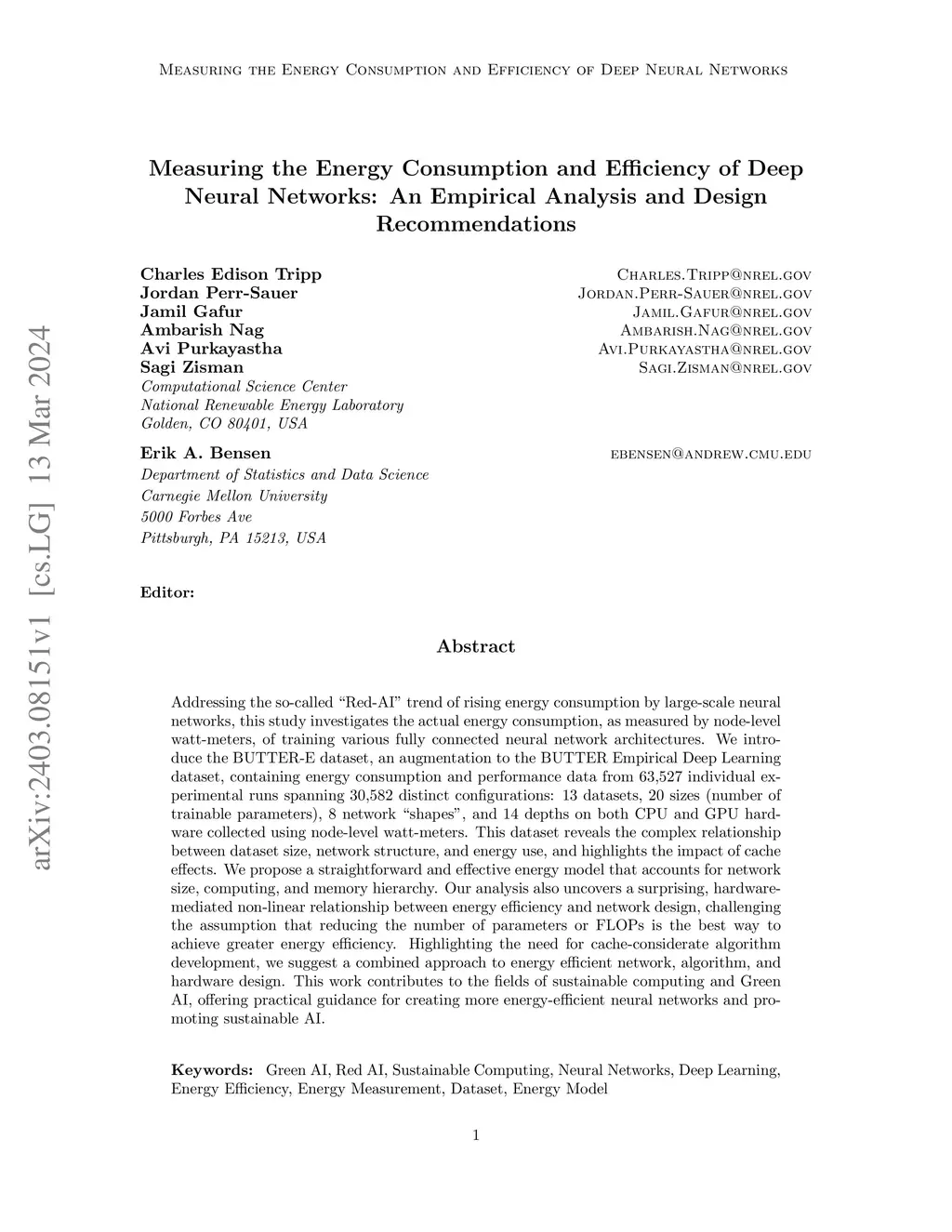 Addressing the so-called ``Red-AI'' trend of rising energy consumption by large-scale neural networks, this study investigates the actual energy consumption, as measured by node-level watt-meters, of training various fully connected neural network architectures. We introduce the BUTTER-E dataset, an augmentation to the BUTTER Empirical Deep Learning dataset, containing energy consumption and performance data from 63,527 individual experimental runs spanning 30,582 distinct configurations: 13 datasets, 20 sizes (number of trainable parameters), 8 network ``shapes'', and 14 depths on both CPU and GPU hardware collected using node-level watt-meters. This dataset reveals the complex relationship between dataset size, network structure, and energy use, and highlights the impact of cache effects. We propose a straightforward and effective energy model that accounts for network size, computing, and memory hierarchy. Our analysis also uncovers a surprising, hardware-mediated non-linear relationship between energy efficiency and network design, challenging the assumption that reducing the number of parameters or FLOPs is the best way to achieve greater energy efficiency. Highlighting the need for cache-considerate algorithm development, we suggest a combined approach to energy efficient network, algorithm, and hardware design. This work contributes to the fields of sustainable computing and Green AI, offering practical guidance for creating more energy-efficient neural networks and promoting sustainable AI.