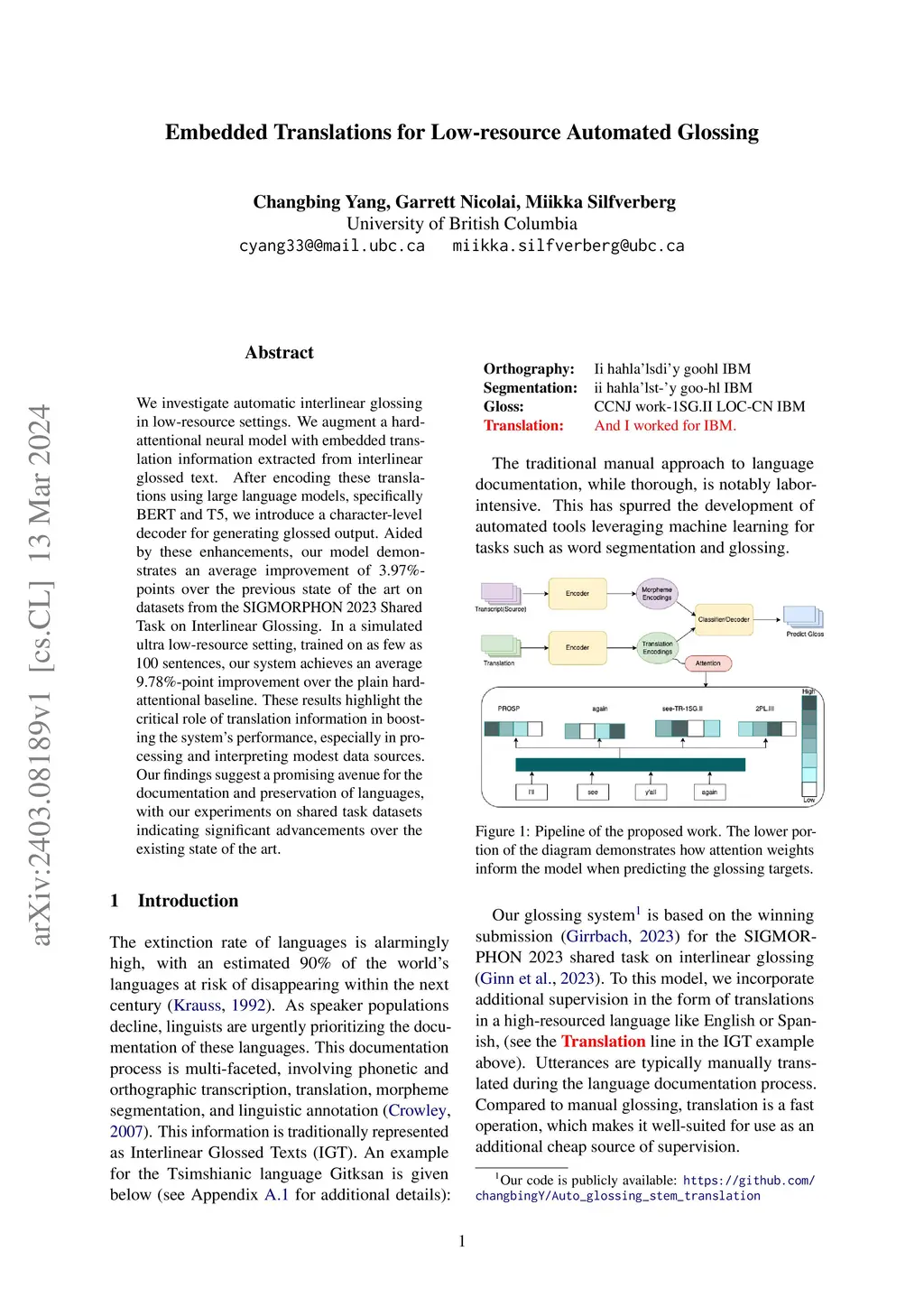 We investigate automatic interlinear glossing in low-resource settings. We augment a hard-attentional neural model with embedded translation information extracted from interlinear glossed text. After encoding these translations using large language models, specifically BERT and T5, we introduce a character-level decoder for generating glossed output. Aided by these enhancements, our model demonstrates an average improvement of 3.97\%-points over the previous state of the art on datasets from the SIGMORPHON 2023 Shared Task on Interlinear Glossing. In a simulated ultra low-resource setting, trained on as few as 100 sentences, our system achieves an average 9.78\%-point improvement over the plain hard-attentional baseline. These results highlight the critical role of translation information in boosting the system's performance, especially in processing and interpreting modest data sources. Our findings suggest a promising avenue for the documentation and preservation of languages, with our experiments on shared task datasets indicating significant advancements over the existing state of the art.