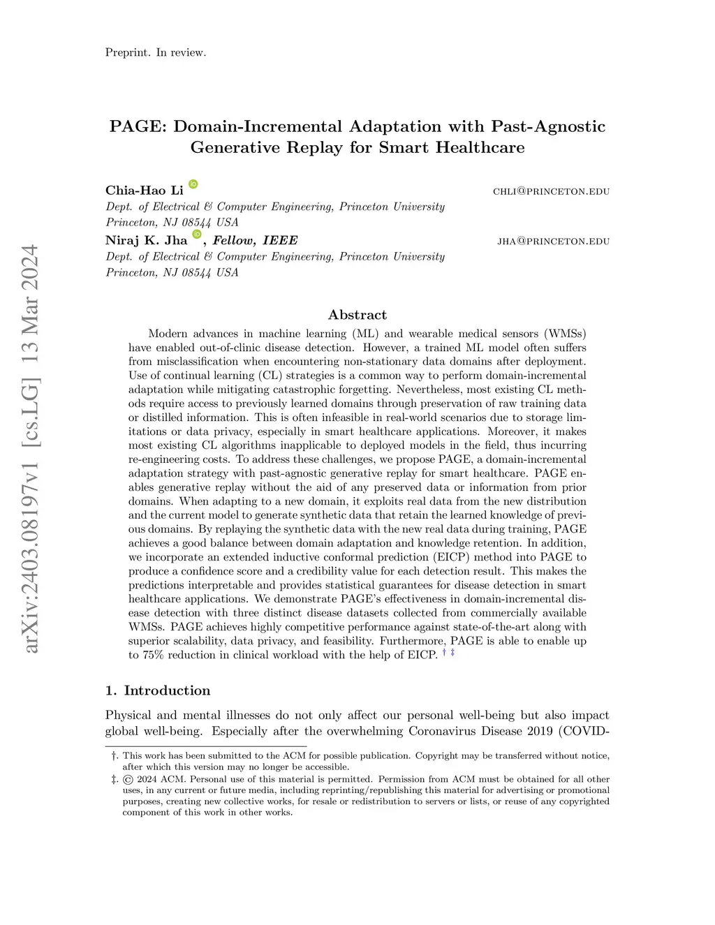 We propose PAGE, a domain-incremental adaptation strategy with past-agnostic generative replay for smart healthcare. PAGE enables generative replay without the aid of any preserved data or information from prior domains. When adapting to a new domain, it exploits real data from the new distribution and the current model to generate synthetic data that retain the learned knowledge of previous domains. By replaying the synthetic data with the new real data during training, PAGE achieves a good balance between domain adaptation and knowledge retention. In addition, we incorporate an extended inductive conformal prediction (EICP) method into PAGE to produce a confidence score and a credibility value for each detection result. This makes the predictions interpretable and provides statistical guarantees for disease detection in smart healthcare applications. We demonstrate PAGE's effectiveness in domain-incremental disease detection with three distinct disease datasets collected from commercially available WMSs. PAGE achieves highly competitive performance against state-of-the-art with superior scalability, data privacy, and feasibility. Furthermore, PAGE can enable up to 75% reduction in clinical workload with the help of EICP.