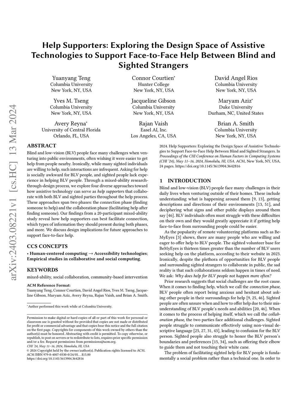 Blind and low-vision (BLV) people face many challenges when venturing into public environments, often wishing it were easier to get help from people nearby. Ironically, while many sighted individuals are willing to help, such interactions are infrequent. Asking for help is socially awkward for BLV people, and sighted people lack experience in helping BLV people. Through a mixed-ability research-through-design process, we explore four diverse approaches toward how assistive technology can serve as help supporters that collaborate with both BLV and sighted parties throughout the help process. These approaches span two phases: the connection phase (finding someone to help) and the collaboration phase (facilitating help after finding someone). Our findings from a 20-participant mixed-ability study reveal how help supporters can best facilitate connection, which types of information they should present during both phases, and more. We discuss design implications for future approaches to support face-to-face help.