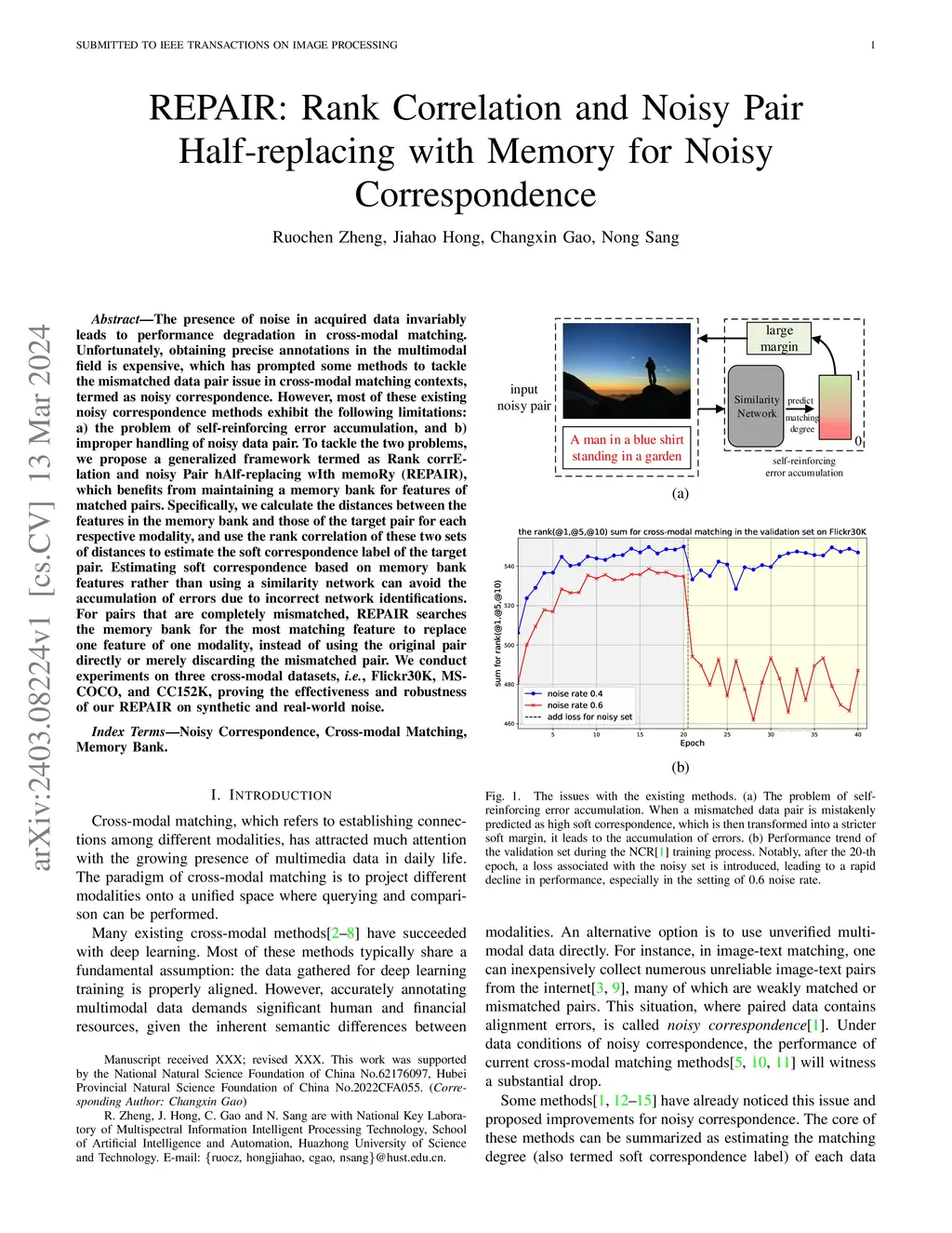 The presence of noise in acquired data invariably leads to performance degradation in cross-modal matching. Unfortunately, obtaining precise annotations in the multimodal field is expensive, which has prompted some methods to tackle the mismatched data pair issue in cross-modal matching contexts, termed as noisy correspondence. However, most of these existing noisy correspondence methods exhibit the following limitations: a) the problem of self-reinforcing error accumulation, and b) improper handling of noisy data pair. To tackle the two problems, we propose a generalized framework termed as Rank corrElation and noisy Pair hAlf-replacing wIth memoRy (REPAIR), which benefits from maintaining a memory bank for features of matched pairs. Specifically, we calculate the distances between the features in the memory bank and those of the target pair for each respective modality, and use the rank correlation of these two sets of distances to estimate the soft correspondence label of the target pair. Estimating soft correspondence based on memory bank features rather than using a similarity network can avoid the accumulation of errors due to incorrect network identifications. For pairs that are completely mismatched, REPAIR searches the memory bank for the most matching feature to replace one feature of one modality, instead of using the original pair directly or merely discarding the mismatched pair. We conduct experiments on three cross-modal datasets, i.e., Flickr30K, MSCOCO, and CC152K, proving the effectiveness and robustness of our REPAIR on synthetic and real-world noise.