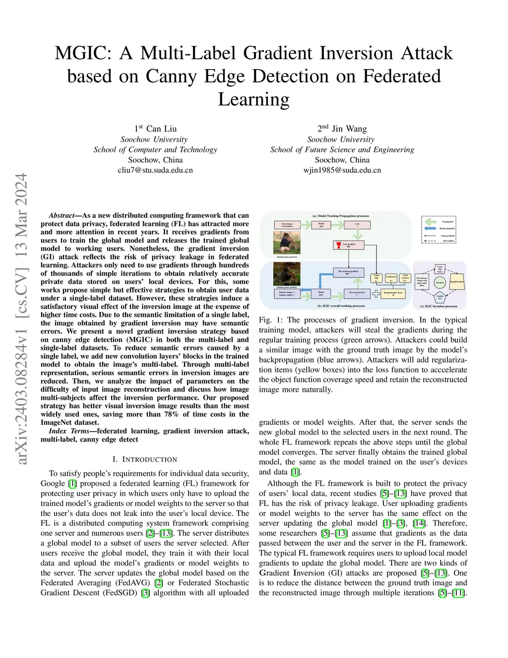 As a new distributed computing framework that can protect data privacy, federated learning (FL) has attracted more and more attention in recent years. It receives gradients from users to train the global model and releases the trained global model to working users. Nonetheless, the gradient inversion (GI) attack reflects the risk of privacy leakage in federated learning. Attackers only need to use gradients through hundreds of thousands of simple iterations to obtain relatively accurate private data stored on users' local devices. For this, some works propose simple but effective strategies to obtain user data under a single-label dataset. However, these strategies induce a satisfactory visual effect of the inversion image at the expense of higher time costs. Due to the semantic limitation of a single label, the image obtained by gradient inversion may have semantic errors. We present a novel gradient inversion strategy based on canny edge detection (MGIC) in both the multi-label and single-label datasets. To reduce semantic errors caused by a single label, we add new convolution layers' blocks in the trained model to obtain the image's multi-label. Through multi-label representation, serious semantic errors in inversion images are reduced. Then, we analyze the impact of parameters on the difficulty of input image reconstruction and discuss how image multi-subjects affect the inversion performance. Our proposed strategy has better visual inversion image results than the most widely used ones, saving more than 78% of time costs in the ImageNet dataset.