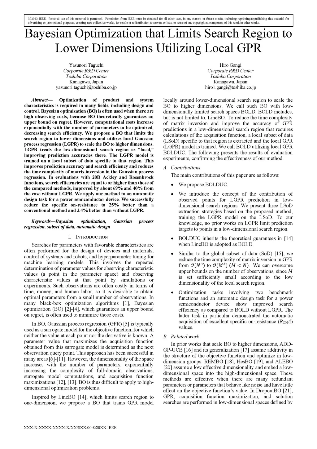 Optimization of product and system characteristics is required in many fields, including design and control. Bayesian optimization (BO) is often used when there are high observing costs, because BO theoretically guarantees an upper bound on regret. However, computational costs increase exponentially with the number of parameters to be optimized, decreasing search efficiency. We propose a BO that limits the search region to lower dimensions and utilizes local Gaussian process regression (LGPR) to scale the BO to higher dimensions. LGPR treats the low-dimensional search region as "local," improving prediction accuracies there. The LGPR model is trained on a local subset of data specific to that region. This improves prediction accuracy and search efficiency and reduces the time complexity of matrix inversion in the Gaussian process regression. In evaluations with 20D Ackley and Rosenbrock functions, search efficiencies are equal to or higher than those of the compared methods, improved by about 69% and 40% from the case without LGPR. We apply our method to an automatic design task for a power semiconductor device. We successfully reduce the specific on-resistance to 25% better than a conventional method and 3.4% better than without LGPR.