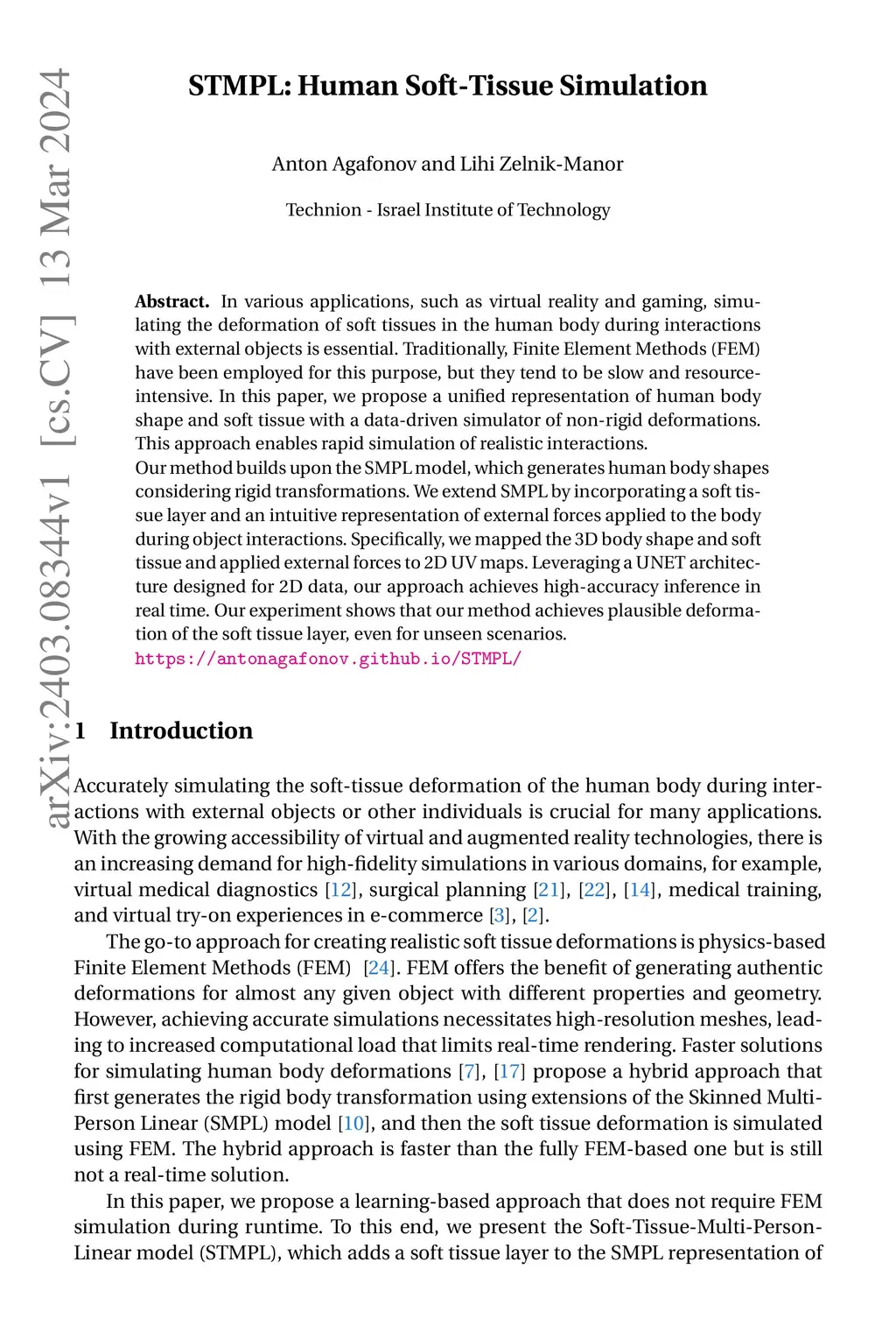 In various applications, such as virtual reality and gaming, simulating the deformation of soft tissues in the human body during interactions with external objects is essential. Traditionally, Finite Element Methods (FEM) have been employed for this purpose, but they tend to be slow and resource-intensive. In this paper, we propose a unified representation of human body shape and soft tissue with a data-driven simulator of non-rigid deformations. This approach enables rapid simulation of realistic interactions. Our method builds upon the SMPL model, which generates human body shapes considering rigid transformations. We extend SMPL by incorporating a soft tissue layer and an intuitive representation of external forces applied to the body during object interactions. Specifically, we mapped the 3D body shape and soft tissue and applied external forces to 2D UV maps. Leveraging a UNET architecture designed for 2D data, our approach achieves high-accuracy inference in real time. Our experiment shows that our method achieves plausible deformation of the soft tissue layer, even for unseen scenarios.