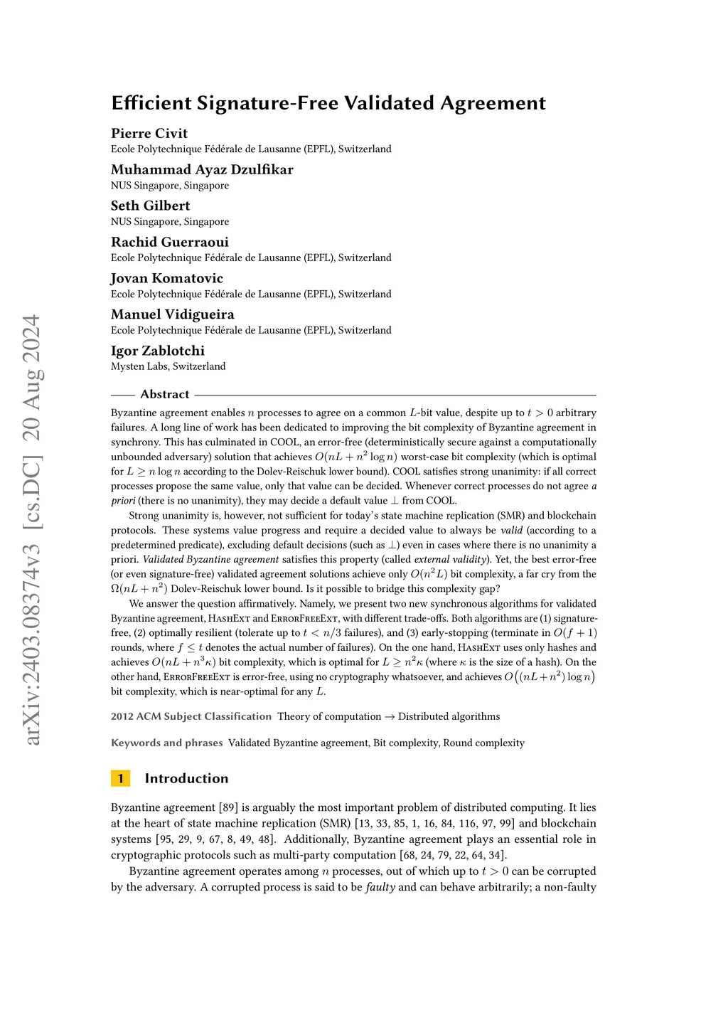 Byzantine agreement enables n processes to agree on a common L-bit value, despite up to t > 0 arbitrary failures. A long line of work has been dedicated to improving the bit complexity of Byzantine agreement in synchrony. This has culminated in COOL, an error-free (deterministically secure against a computationally unbounded adversary) solution that achieves O(nL + n^2 logn) worst-case bit complexity (which is optimal for L > n logn according to the Dolev-Reischuk lower bound). COOL satisfies strong validity: if all correct processes propose the same value, only that value can be decided. Strong validity is, however, not appropriate for today's state machine replication (SMR) and blockchain protocols. These systems value progress and require a decided value to always be valid, excluding default decisions (such as EMPTY) even in cases where there is no unanimity a priori. Validated Byzantine agreement satisfies this property (called external validity). Yet, the best error-free (or even signature-free) validated agreement solutions achieve only O(n^2L) bit complexity, a far cry from the Omega(nL + n^2) Dolev-Reishcuk lower bound. In this paper, we present two new synchronous algorithms for validated Byzantine agreement, HashExt and ErrorFreeExt, with different trade-offs. Both algorithms are (1) signature-free, (2) optimally resilient (tolerate up to t < n / 3 failures), and (3) early-stopping (terminate in O(f+1) rounds, where f <= t is the actual number of failures). On the one hand, HashExt uses only hashes and achieves O(nL + n^3 kappa) bit complexity, which is optimal for L > n^2 kappa (where kappa is the size of a hash). On the other hand, ErrorFreeExt is error-free, using no cryptography whatsoever, and achieves O( (nL + n^2) logn ) bit complexity, which is near-optimal for any L.