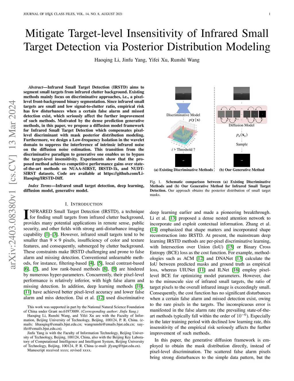 Infrared Small Target Detection (IRSTD) aims to segment small targets from infrared clutter background. Existing methods mainly focus on discriminative approaches, i.e., a pixel-level front-background binary segmentation. Since infrared small targets are small and low signal-to-clutter ratio, empirical risk has few disturbances when a certain false alarm and missed detection exist, which seriously affect the further improvement of such methods. Motivated by the dense prediction generative methods, in this paper, we propose a diffusion model framework for Infrared Small Target Detection which compensates pixel-level discriminant with mask posterior distribution modeling. Furthermore, we design a Low-frequency Isolation in the wavelet domain to suppress the interference of intrinsic infrared noise on the diffusion noise estimation. This transition from the discriminative paradigm to generative one enables us to bypass the target-level insensitivity. Experiments show that the proposed method achieves competitive performance gains over state-of-the-art methods on NUAA-SIRST, IRSTD-1k, and NUDT-SIRST datasets. Code are available at https://github.com/Li-Haoqing/IRSTD-Diff.