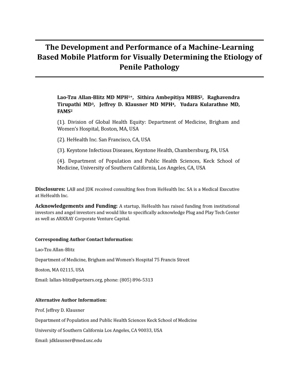 Machine-learning algorithms can facilitate low-cost, user-guided visual diagnostic platforms for addressing disparities in access to sexual health services. We developed a clinical image dataset using original and augmented images for five penile diseases: herpes eruption, syphilitic chancres, penile candidiasis, penile cancer, and genital warts. We used a U-net architecture model for semantic pixel segmentation into background or subject image, the Inception-ResNet version 2 neural architecture to classify each pixel as diseased or non-diseased, and a salience map using GradCAM++. We trained the model on a random 91% sample of the image database using 150 epochs per image, and evaluated the model on the remaining 9% of images, assessing recall (or sensitivity), precision, specificity, and F1-score (accuracy). Of the 239 images in the validation dataset, 45 (18.8%) were of genital warts, 43 (18.0%) were of HSV infection, 29 (12.1%) were of penile cancer, 40 (16.7%) were of penile candidiasis, 37 (15.5%) were of syphilitic chancres, and 45 (18.8%) were of non-diseased penises. The overall accuracy of the model for correctly classifying the diseased image was 0.944. Between July 1st and October 1st 2023, there were 2,640 unique users of the mobile platform. Among a random sample of submissions (n=437), 271 (62.0%) were from the United States, 64 (14.6%) from Singapore, 41 (9.4%) from Candia, 40 (9.2%) from the United Kingdom, and 21 (4.8%) from Vietnam. The majority (n=277 [63.4%]) were between 18 and 30 years old. We report on the development of a machine-learning model for classifying five penile diseases, which demonstrated excellent performance on a validation dataset. That model is currently in use globally and has the potential to improve access to diagnostic services for penile diseases.