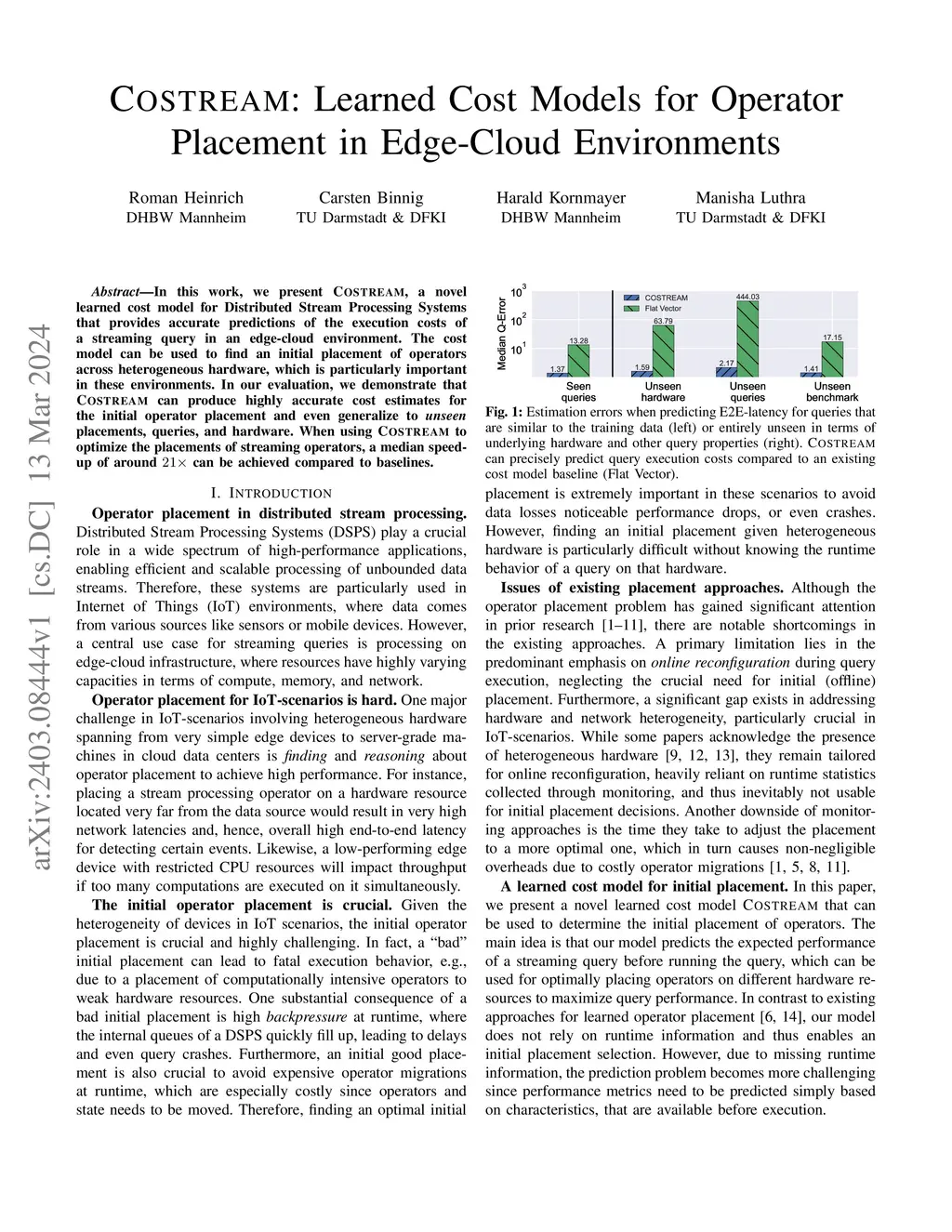 In this work, we present COSTREAM, a novel learned cost model for Distributed Stream Processing Systems that provides accurate predictions of the execution costs of a streaming query in an edge-cloud environment. The cost model can be used to find an initial placement of operators across heterogeneous hardware, which is particularly important in these environments. In our evaluation, we demonstrate that COSTREAM can produce highly accurate cost estimates for the initial operator placement and even generalize to unseen placements, queries, and hardware. When using COSTREAM to optimize the placements of streaming operators, a median speed-up of around 21x can be achieved compared to baselines.