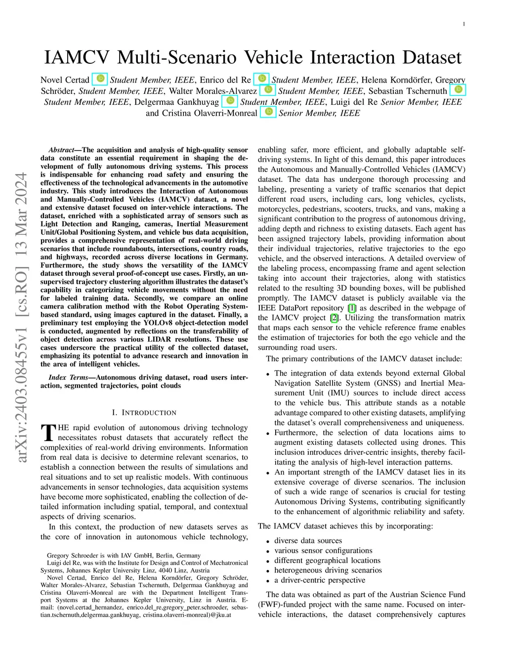 The acquisition and analysis of high-quality sensor data constitute an essential requirement in shaping the development of fully autonomous driving systems. This process is indispensable for enhancing road safety and ensuring the effectiveness of the technological advancements in the automotive industry. This study introduces the Interaction of Autonomous and Manually-Controlled Vehicles (IAMCV) dataset, a novel and extensive dataset focused on inter-vehicle interactions. The dataset, enriched with a sophisticated array of sensors such as Light Detection and Ranging, cameras, Inertial Measurement Unit/Global Positioning System, and vehicle bus data acquisition, provides a comprehensive representation of real-world driving scenarios that include roundabouts, intersections, country roads, and highways, recorded across diverse locations in Germany. Furthermore, the study shows the versatility of the IAMCV dataset through several proof-of-concept use cases. Firstly, an unsupervised trajectory clustering algorithm illustrates the dataset's capability in categorizing vehicle movements without the need for labeled training data. Secondly, we compare an online camera calibration method with the Robot Operating System-based standard, using images captured in the dataset. Finally, a preliminary test employing the YOLOv8 object-detection model is conducted, augmented by reflections on the transferability of object detection across various LIDAR resolutions. These use cases underscore the practical utility of the collected dataset, emphasizing its potential to advance research and innovation in the area of intelligent vehicles.