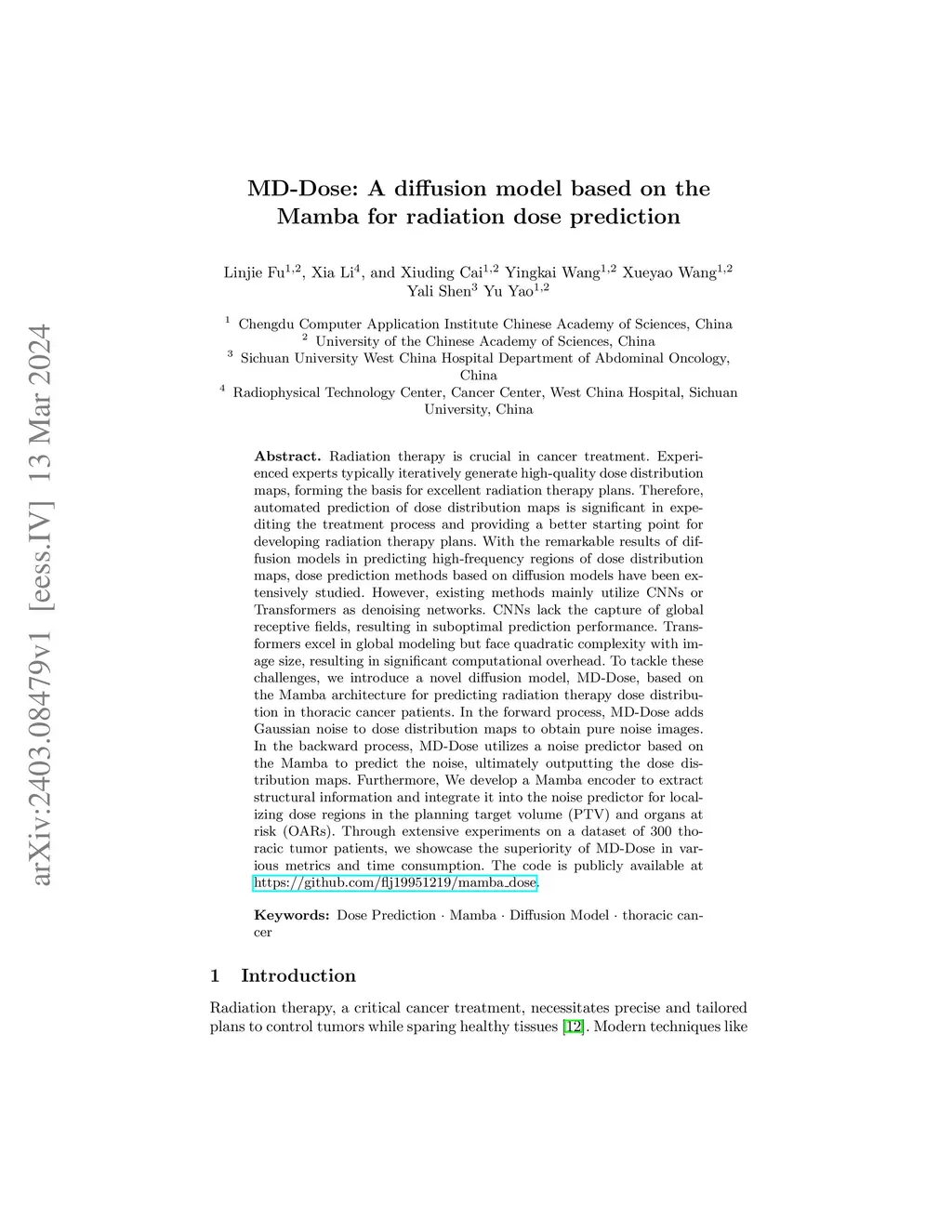 MD-Dose: A diffusion model based on the Mamba for radiation dose prediction