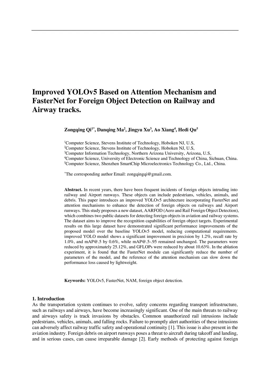 In recent years, there have been frequent incidents of foreign objects intruding into railway and Airport runways. These objects can include pedestrians, vehicles, animals, and debris. This paper introduces an improved YOLOv5 architecture incorporating FasterNet and attention mechanisms to enhance the detection of foreign objects on railways and Airport runways. This study proposes a new dataset, AARFOD (Aero and Rail Foreign Object Detection), which combines two public datasets for detecting foreign objects in aviation and railway systems.The dataset aims to improve the recognition capabilities of foreign object targets. Experimental results on this large dataset have demonstrated significant performance improvements of the proposed model over the baseline YOLOv5 model, reducing computational requirements.Improved YOLO model shows a significant improvement in precision by 1.2%, recall rate by 1.0%, and mAP@.5 by 0.6%, while mAP@.5-.95 remained unchanged. The parameters were reduced by approximately 25.12%, and GFLOPs were reduced by about 10.63%. In the ablation experiment, it is found that the FasterNet module can significantly reduce the number of parameters of the model, and the reference of the attention mechanism can slow down the performance loss caused by lightweight.