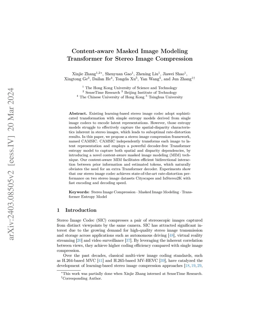 Existing learning-based stereo image codec adopt sophisticated transformation with simple entropy models derived from single image codecs to encode latent representations. However, those entropy models struggle to effectively capture the spatial-disparity characteristics inherent in stereo images, which leads to suboptimal rate-distortion results. In this paper, we propose a stereo image compression framework, named CAMSIC. CAMSIC independently transforms each image to latent representation and employs a powerful decoder-free Transformer entropy model to capture both spatial and disparity dependencies, by introducing a novel content-aware masked image modeling (MIM) technique. Our content-aware MIM facilitates efficient bidirectional interaction between prior information and estimated tokens, which naturally obviates the need for an extra Transformer decoder. Experiments show that our stereo image codec achieves state-of-the-art rate-distortion performance on two stereo image datasets Cityscapes and InStereo2K with fast encoding and decoding speed. Code is available atthis https URL.