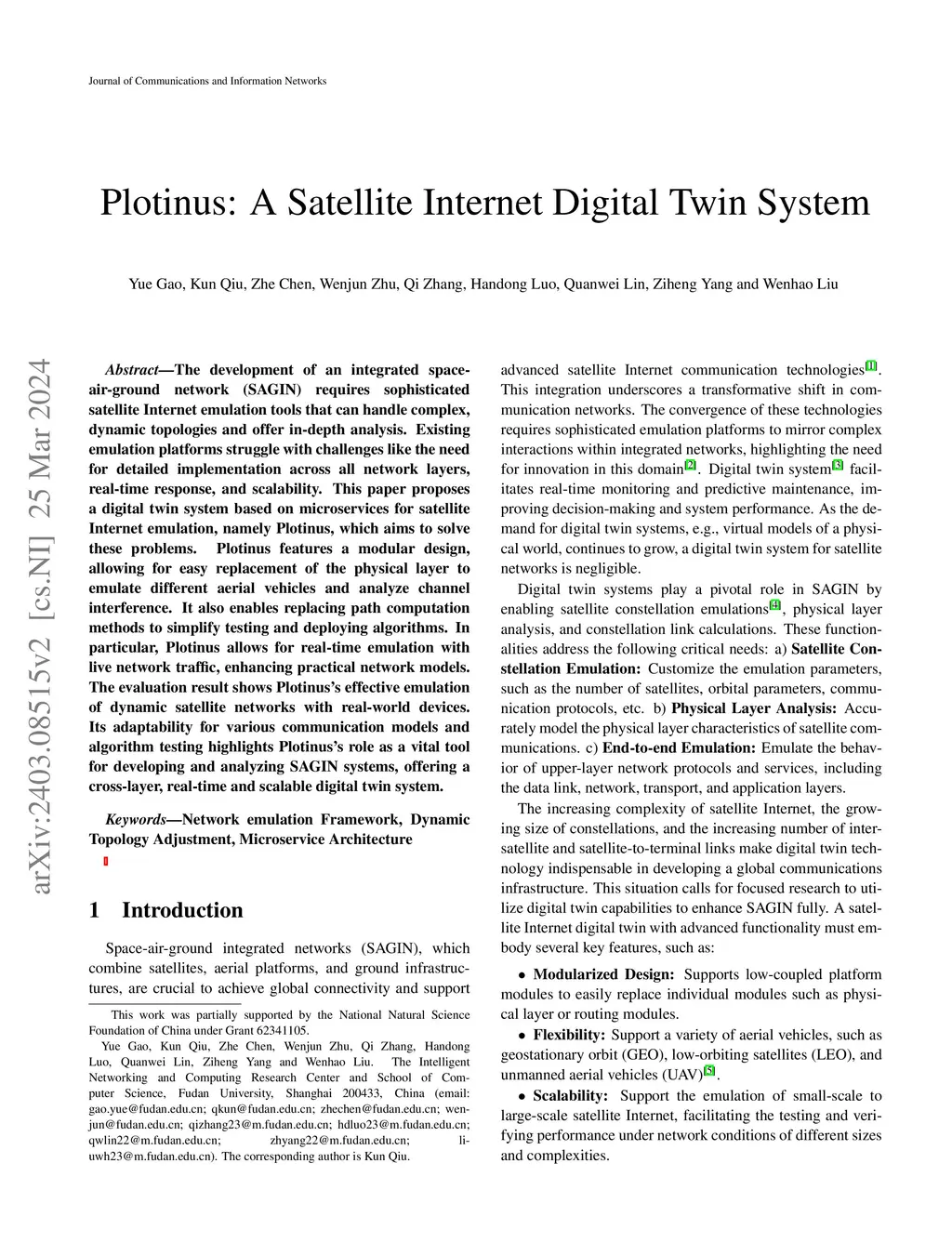 The development of an integrated space-air-ground network (SAGIN) requires sophisticated satellite Internet emulation tools that can handle complex, dynamic topologies and offer in-depth analysis. Existing emulation platforms struggle with challenges like the need for detailed implementation across all network layers, real-time response, and scalability. This paper proposes a digital twin system based on microservices for satellite Internet emulation, namely Plotinus, which aims to solve these problems. Plotinus features a modular design, allowing for easy replacement of the physical layer to emulate different aerial vehicles and analyze channel interference. It also enables replacing path computation methods to simplify testing and deploying algorithms. In particular, Plotinus allows for real-time emulation with live network traffic, enhancing practical network models. The evaluation result shows Plotinus's effective emulation of dynamic satellite networks with real-world devices. Its adaptability for various communication models and algorithm testing highlights Plotinus's role as a vital tool for developing and analyzing SAGIN systems, offering a cross-layer, real-time and scalable digital twin system.