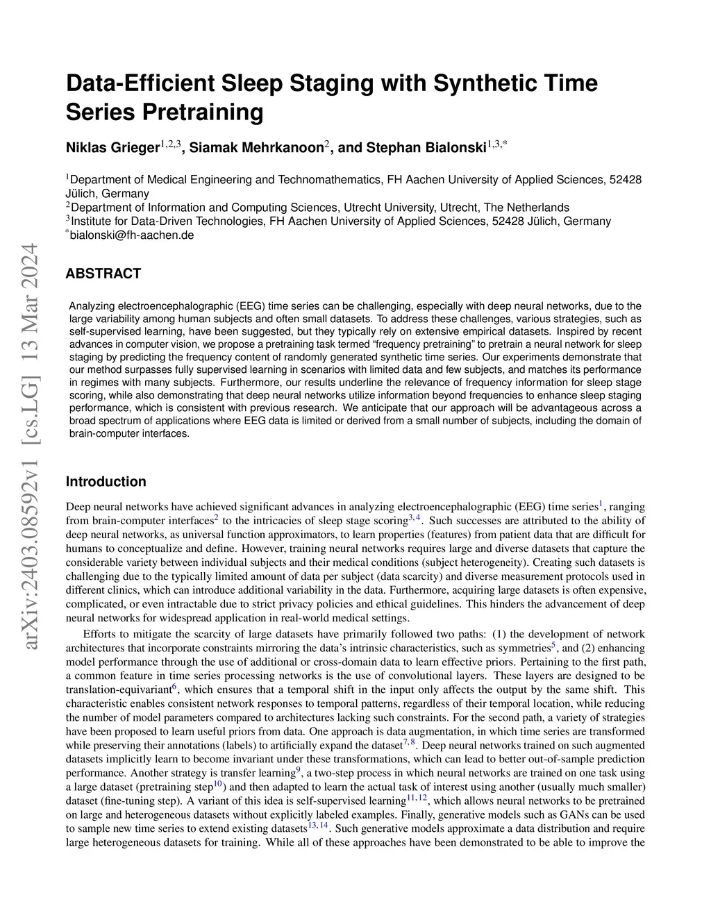 Analyzing electroencephalographic (EEG) time series can be challenging, especially with deep neural networks, due to the large variability among human subjects and often small datasets. To address these challenges, various strategies, such as self-supervised learning, have been suggested, but they typically rely on extensive empirical datasets. Inspired by recent advances in computer vision, we propose a pretraining task termed "frequency pretraining" to pretrain a neural network for sleep staging by predicting the frequency content of randomly generated synthetic time series. Our experiments demonstrate that our method surpasses fully supervised learning in scenarios with limited data and few subjects, and matches its performance in regimes with many subjects. Furthermore, our results underline the relevance of frequency information for sleep stage scoring, while also demonstrating that deep neural networks utilize information beyond frequencies to enhance sleep staging performance, which is consistent with previous research. We anticipate that our approach will be advantageous across a broad spectrum of applications where EEG data is limited or derived from a small number of subjects, including the domain of brain-computer interfaces.