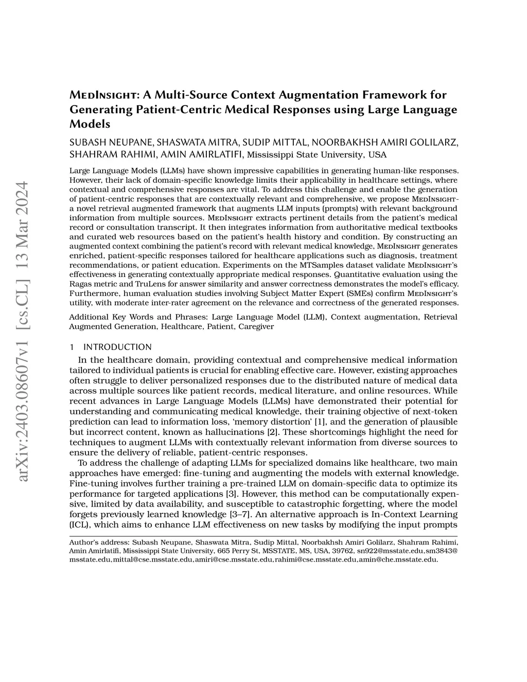 Large Language Models (LLMs) have shown impressive capabilities in generating human-like responses. However, their lack of domain-specific knowledge limits their applicability in healthcare settings, where contextual and comprehensive responses are vital. To address this challenge and enable the generation of patient-centric responses that are contextually relevant and comprehensive, we propose MedInsight:a novel retrieval augmented framework that augments LLM inputs (prompts) with relevant background information from multiple sources. MedInsight extracts pertinent details from the patient's medical record or consultation transcript. It then integrates information from authoritative medical textbooks and curated web resources based on the patient's health history and condition. By constructing an augmented context combining the patient's record with relevant medical knowledge, MedInsight generates enriched, patient-specific responses tailored for healthcare applications such as diagnosis, treatment recommendations, or patient education. Experiments on the MTSamples dataset validate MedInsight's effectiveness in generating contextually appropriate medical responses. Quantitative evaluation using the Ragas metric and TruLens for answer similarity and answer correctness demonstrates the model's efficacy. Furthermore, human evaluation studies involving Subject Matter Expert (SMEs) confirm MedInsight's utility, with moderate inter-rater agreement on the relevance and correctness of the generated responses.