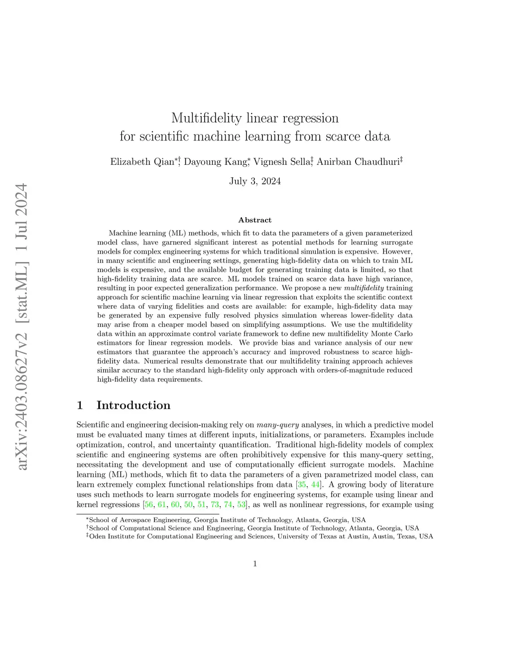 Multifidelity linear regression for scientific machine learning from