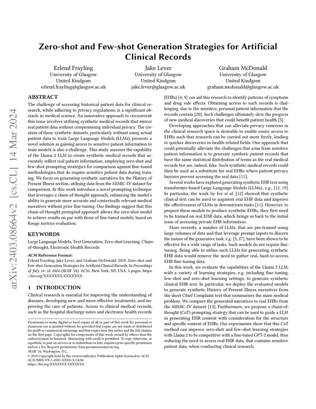 The challenge of accessing historical patient data for clinical research, while adhering to privacy regulations, is a significant obstacle in medical science. An innovative approach to circumvent this issue involves utilising synthetic medical records that mirror real patient data without compromising individual privacy. The creation of these synthetic datasets, particularly without using actual patient data to train Large Language Models (LLMs), presents a novel solution as gaining access to sensitive patient information to train models is also a challenge. This study assesses the capability of the Llama 2 LLM to create synthetic medical records that accurately reflect real patient information, employing zero-shot and few-shot prompting strategies for comparison against fine-tuned methodologies that do require sensitive patient data during training. We focus on generating synthetic narratives for the History of Present Illness section, utilising data from the MIMIC-IV dataset for comparison. In this work introduce a novel prompting technique that leverages a chain-of-thought approach, enhancing the model's ability to generate more accurate and contextually relevant medical narratives without prior fine-tuning. Our findings suggest that this chain-of-thought prompted approach allows the zero-shot model to achieve results on par with those of fine-tuned models, based on Rouge metrics evaluation.