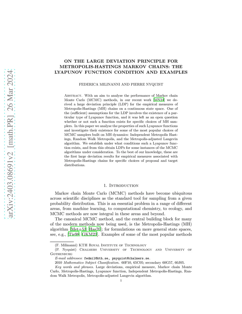 With an aim to analyse the performance of Markov chain Monte Carlo (MCMC) methods, in our recent work we derive a large deviation principle (LDP) for the empirical measures of Metropolis-Hastings (MH) chains on a continuous state space. One of the (sufficient) assumptions for the LDP involves the existence of a particular type of Lyapunov function, and it was left as an open question whether or not such a function exists for specific choices of MH samplers. In this paper we analyse the properties of such Lyapunov functions and investigate their existence for some of the most popular choices of MCMC samplers built on MH dynamics: Independent Metropolis Hastings, Random Walk Metropolis, and the Metropolis-adjusted Langevin algorithm. We establish under what conditions such a Lyapunov function exists, and from this obtain LDPs for some instances of the MCMC algorithms under consideration. To the best of our knowledge, these are the first large deviation results for empirical measures associated with Metropolis-Hastings chains for specific choices of proposal and target distributions.