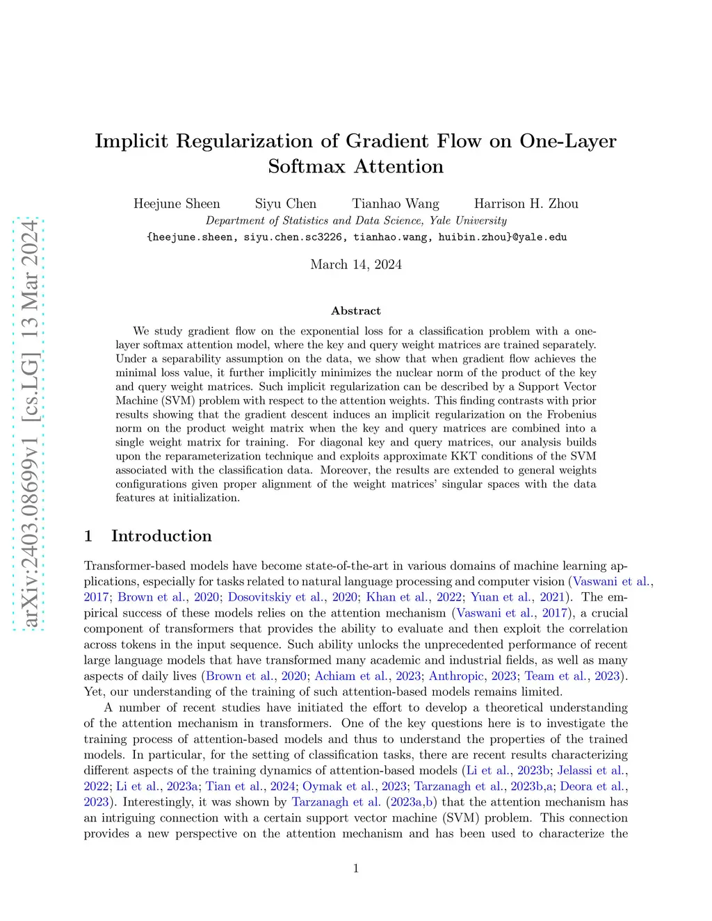 We study gradient flow on the exponential loss for a classification problem with a one-layer softmax attention model, where the key and query weight matrices are trained separately. Under a separability assumption on the data, we show that when gradient flow achieves the minimal loss value, it further implicitly minimizes the nuclear norm of the product of the key and query weight matrices. Such implicit regularization can be described by a Support Vector Machine (SVM) problem with respect to the attention weights. This finding contrasts with prior results showing that the gradient descent induces an implicit regularization on the Frobenius norm on the product weight matrix when the key and query matrices are combined into a single weight matrix for training. For diagonal key and query matrices, our analysis builds upon the reparameterization technique and exploits approximate KKT conditions of the SVM associated with the classification data. Moreover, the results are extended to general weights configurations given proper alignment of the weight matrices' singular spaces with the data features at initialization.