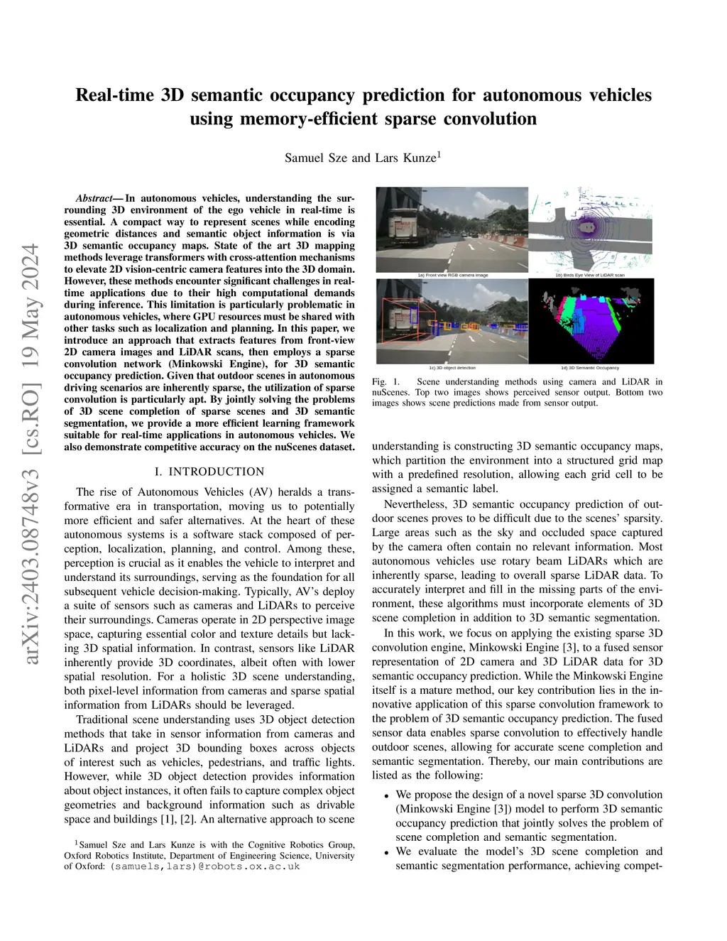 In autonomous vehicles, understanding the surrounding 3D environment of the ego vehicle in real-time is essential. A compact way to represent scenes while encoding geometric distances and semantic object information is via 3D semantic occupancy maps. State of the art 3D mapping methods leverage transformers with cross-attention mechanisms to elevate 2D vision-centric camera features into the 3D domain. However, these methods encounter significant challenges in real-time applications due to their high computational demands during inference. This limitation is particularly problematic in autonomous vehicles, where GPU resources must be shared with other tasks such as localization and planning. In this paper, we introduce an approach that extracts features from front-view 2D camera images and LiDAR scans, then employs a sparse convolution network (Minkowski Engine), for 3D semantic occupancy prediction. Given that outdoor scenes in autonomous driving scenarios are inherently sparse, the utilization of sparse convolution is particularly apt. By jointly solving the problems of 3D scene completion of sparse scenes and 3D semantic segmentation, we provide a more efficient learning framework suitable for real-time applications in autonomous vehicles. We also demonstrate competitive accuracy on the nuScenes dataset.