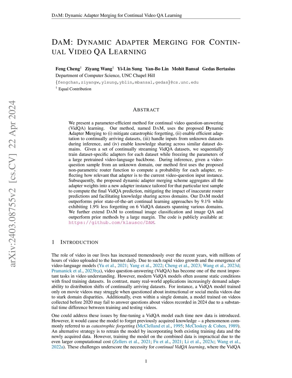 We present a parameter-efficient method for continual video question-answering (VidQA) learning. Our method, named DAM, uses the proposed Dynamic Adapter Merging to (i) mitigate catastrophic forgetting, (ii) enable efficient adaptation to continually arriving datasets, (iii) handle inputs from unknown datasets during inference, and (iv) enable knowledge sharing across similar dataset domains. Given a set of continually streaming VidQA datasets, we sequentially train dataset-specific adapters for each dataset while freezing the parameters of a large pretrained video-language backbone. During inference, given a video-question sample from an unknown domain, our method first uses the proposed non-parametric router function to compute a probability for each adapter, reflecting how relevant that adapter is to the current video-question input instance. Subsequently, the proposed dynamic adapter merging scheme aggregates all the adapter weights into a new adapter instance tailored for that particular test sample to compute the final VidQA prediction, mitigating the impact of inaccurate router predictions and facilitating knowledge sharing across domains. Our DAM model outperforms prior state-of-the-art continual learning approaches by 9.1% while exhibiting 1.9% less forgetting on 6 VidQA datasets spanning various domains. We further extend DAM to continual image classification and image QA and outperform prior methods by a large margin. The code is publicly available at: https://github.com/klauscc/DAM