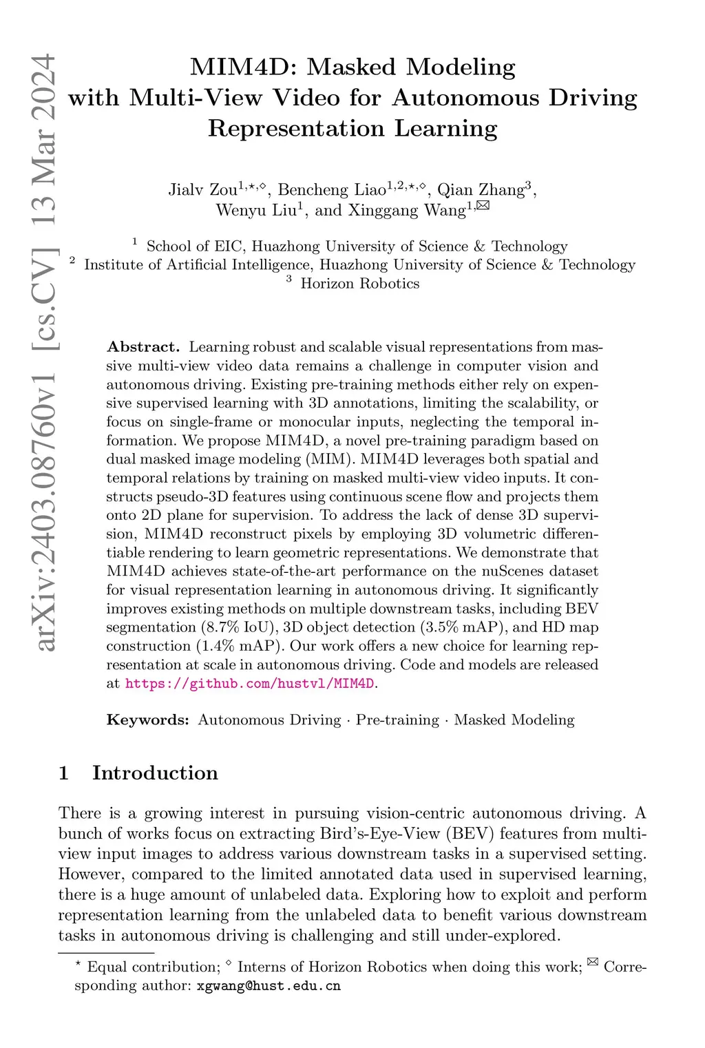 Learning robust and scalable visual representations from massive multi-view video data remains a challenge in computer vision and autonomous driving. Existing pre-training methods either rely on expensive supervised learning with 3D annotations, limiting the scalability, or focus on single-frame or monocular inputs, neglecting the temporal information. We propose MIM4D, a novel pre-training paradigm based on dual masked image modeling (MIM). MIM4D leverages both spatial and temporal relations by training on masked multi-view video inputs. It constructs pseudo-3D features using continuous scene flow and projects them onto 2D plane for supervision. To address the lack of dense 3D supervision, MIM4D reconstruct pixels by employing 3D volumetric differentiable rendering to learn geometric representations. We demonstrate that MIM4D achieves state-of-the-art performance on the nuScenes dataset for visual representation learning in autonomous driving. It significantly improves existing methods on multiple downstream tasks, including BEV segmentation (8.7% IoU), 3D object detection (3.5% mAP), and HD map construction (1.4% mAP). Our work offers a new choice for learning representation at scale in autonomous driving. Code and models are released at https://github.com/hustvl/MIM4D