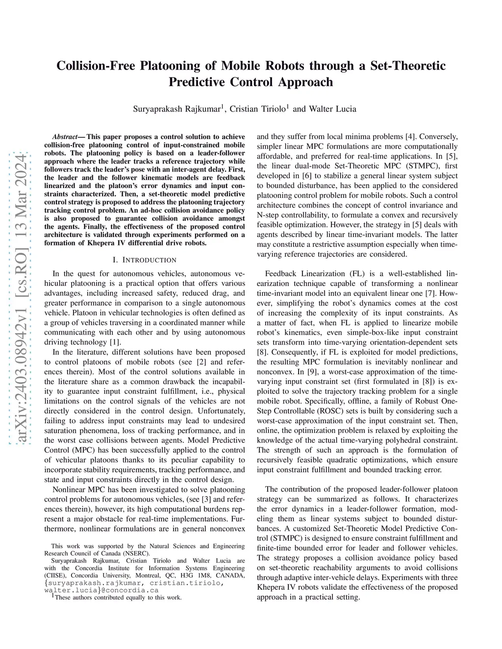 This paper proposes a control solution to achieve collision-free platooning control of input-constrained mobile robots. The platooning policy is based on a leader-follower approach where the leader tracks a reference trajectory while followers track the leader's pose with an inter-agent delay. First, the leader and the follower kinematic models are feedback linearized and the platoon's error dynamics and input constraints characterized. Then, a set-theoretic model predictive control strategy is proposed to address the platooning trajectory tracking control problem. An ad-hoc collision avoidance policy is also proposed to guarantee collision avoidance amongst the agents. Finally, the effectiveness of the proposed control architecture is validated through experiments performed on a formation of Khepera IV differential drive robots