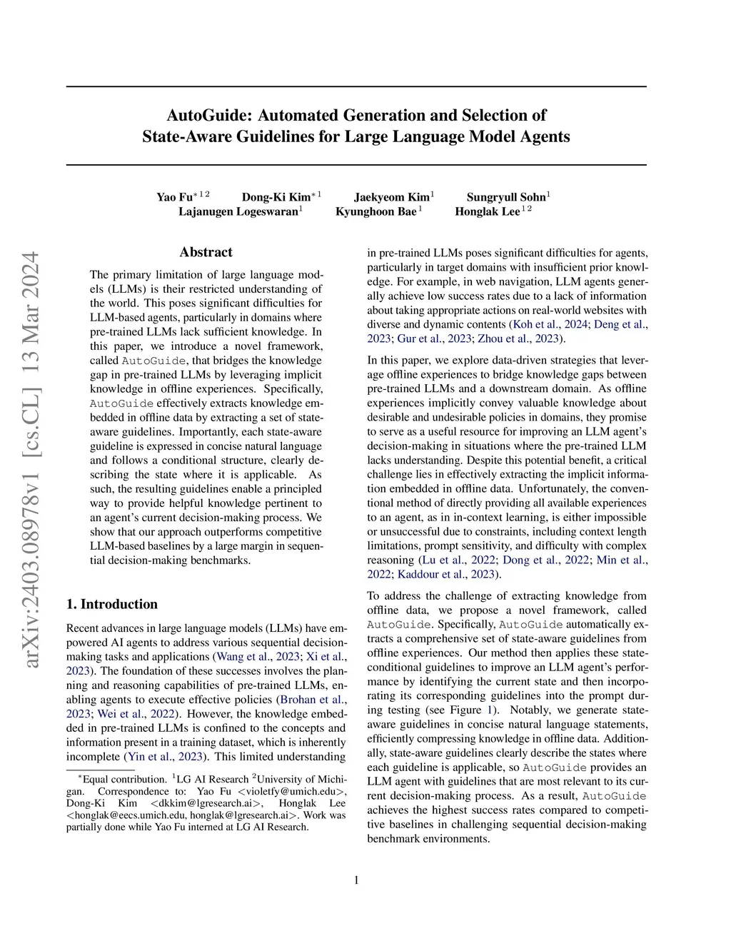 The primary limitation of large language models (LLMs) is their restricted understanding of the world. This poses significant difficulties for LLM-based agents, particularly in domains where pre-trained LLMs lack sufficient knowledge. In this paper, we introduce a novel framework, called AutoGuide, that bridges the knowledge gap in pre-trained LLMs by leveraging implicit knowledge in offline experiences. Specifically, AutoGuide effectively extracts knowledge embedded in offline data by extracting a set of state-aware guidelines. Importantly, each state-aware guideline is expressed in concise natural language and follows a conditional structure, clearly describing the state where it is applicable. As such, the resulting guidelines enable a principled way to provide helpful knowledge pertinent to an agent's current decision-making process. We show that our approach outperforms competitive LLM-based baselines by a large margin in sequential decision-making benchmarks.