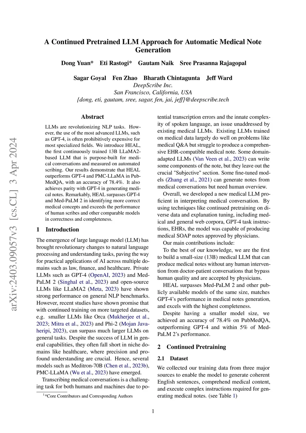 LLMs are revolutionizing NLP tasks. However, the most powerful LLM, like GPT-4, is too costly for most domain-specific scenarios. We present the first continuously trained 13B Llama2-based LLM that is purpose-built for medical conversations and measured on automated scribing. Our results show that our model outperforms GPT-4 in PubMedQA with 76.6\% accuracy and matches its performance in summarizing medical conversations into SOAP notes. Notably, our model exceeds GPT-4 in capturing a higher number of correct medical concepts and outperforms human scribes with higher correctness and completeness.