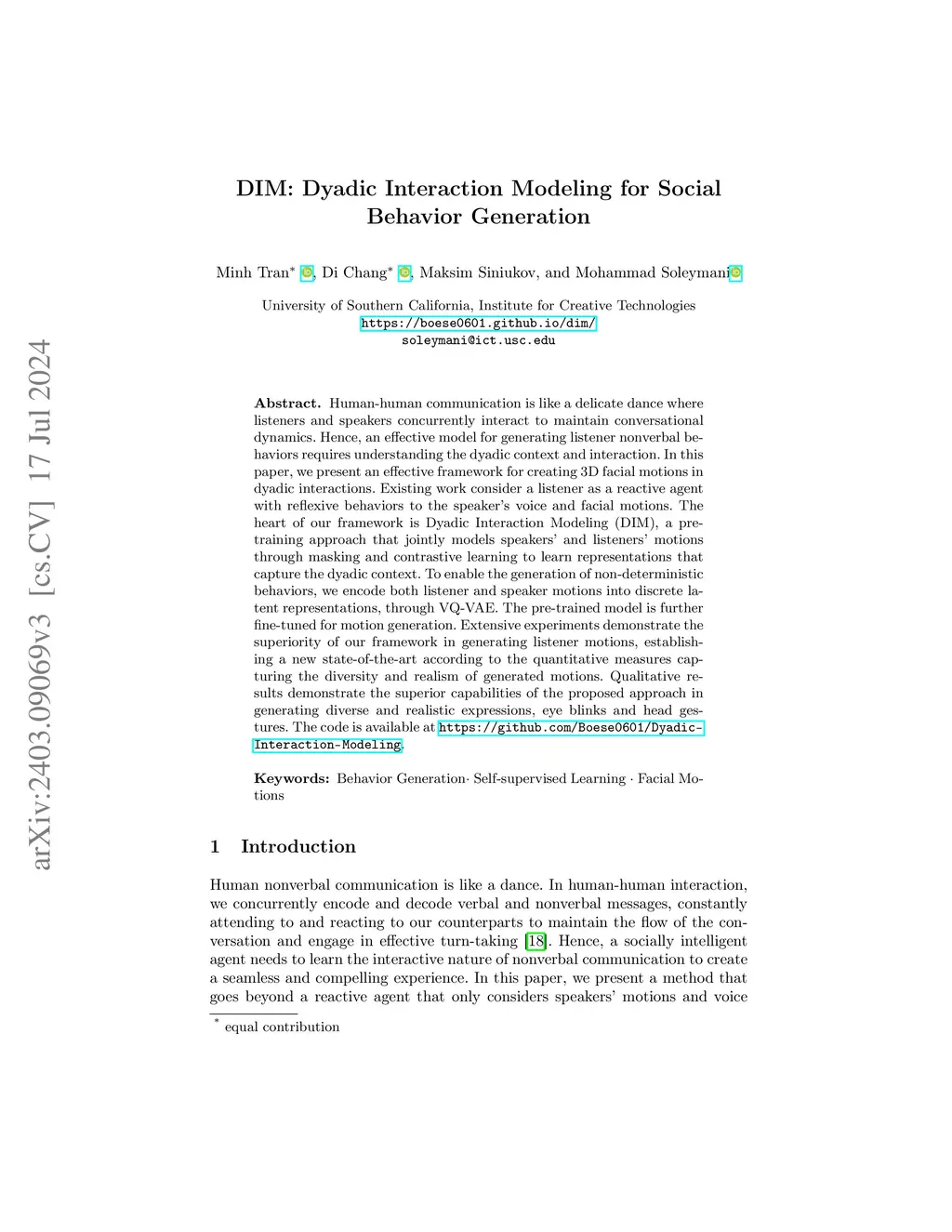 Dyadic Interaction Modeling for Social Behavior Generation