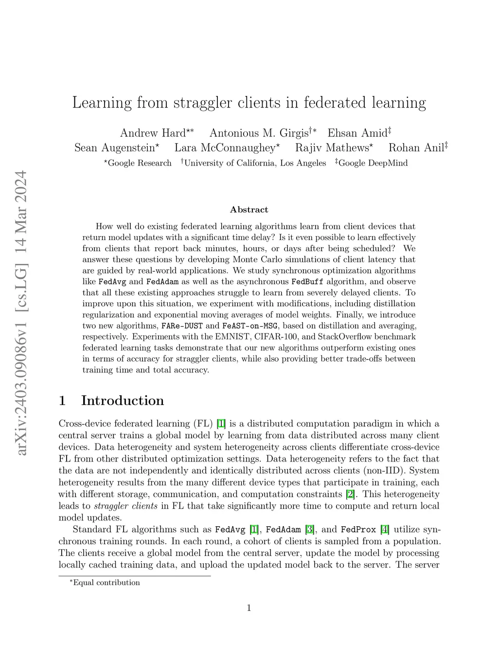 How well do existing federated learning algorithms learn from client devices that return model updates with a significant time delay? Is it even possible to learn effectively from clients that report back minutes, hours, or days after being scheduled? We answer these questions by developing Monte Carlo simulations of client latency that are guided by real-world applications. We study synchronous optimization algorithms like FedAvg and FedAdam as well as the asynchronous FedBuff algorithm, and observe that all these existing approaches struggle to learn from severely delayed clients. To improve upon this situation, we experiment with modifications, including distillation regularization and exponential moving averages of model weights. Finally, we introduce two new algorithms, FARe-DUST and FeAST-on-MSG, based on distillation and averaging, respectively. Experiments with the EMNIST, CIFAR-100, and StackOverflow benchmark federated learning tasks demonstrate that our new algorithms outperform existing ones in terms of accuracy for straggler clients, while also providing better trade-offs between training time and total accuracy.