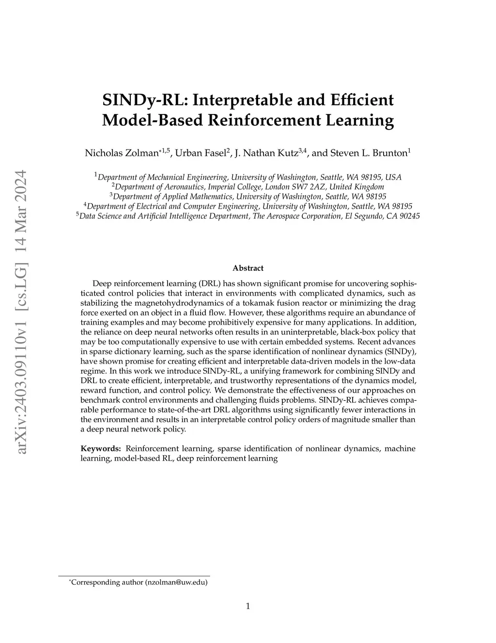 Deep reinforcement learning (DRL) has shown significant promise for uncovering sophisticated control policies that interact in complex environments, such as stabilizing a tokamak fusion reactor or minimizing the drag force on an object in a fluid flow. However, DRL requires an abundance of training examples and may become prohibitively expensive for many applications. In addition, the reliance on deep neural networks often results in an uninterpretable, black-box policy that may be too computationally expensive to use with certain embedded systems. Recent advances in sparse dictionary learning, such as the sparse identification of nonlinear dynamics (SINDy), have shown promise for creating efficient and interpretable data-driven models in the low-data regime. In this work we introduce SINDy-RL, a unifying framework for combining SINDy and DRL to create efficient, interpretable, and trustworthy representations of the dynamics model, reward function, and control policy. We demonstrate the effectiveness of our approaches on benchmark control environments and flow control problems, including gust mitigation on a 3D NACA 0012 airfoil at . SINDy-RL achieves comparable performance to modern DRL algorithms using significantly fewer interactions in the environment and results in an interpretable control policy orders of magnitude smaller than a DRL policy.